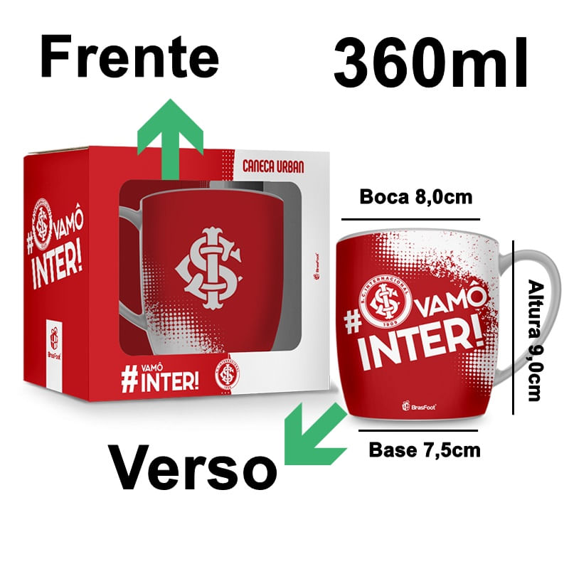 Caneca Urban do # # Vamô Inter fabricada pela BrasFoot em Porcelana Premium Produto Oficial e Licenciado com capacidade para 360 ml e desenhos do time aplicados.Ideal para presentear e colecionar.Destacamos que os desenhos aplicados e as tonalidades deles além da cor da caneca poderão sofrer alterações dependendo da remessa do fabricante.Caneca Porcelana Premium BrasFoot # Vamô Inter 360 ML Urban Licenciada BrancoTodas as informações divulgadas são de responsabilidade do fabricante/fornecedor.Marca: BrasFootClassificação: Caneca TimesMaterial: Porcelana PremiumConteúdo e Medidas: Caneca De Porcelana Urban Premium Estampa - # # Vamô Inter - Internacional 3 - 01 Peça.Tamanho Aproximado( Boca Ø 8,0cm - Altura 9,0cm - Base 7,5cm)Capacidade: 360mlA caneca vai em uma caixa Litografada personalizada e é um Produto Oficial licenciado.Observações:Lavar com detergente neutro, esponja macia e secar imediatamente.Não colocar em máquina de Lava-louças.Cuidados: Nao Utilizar produtos quimicos ou abrasivos .Impactos podem danificar o produtoProduto Original Oficial Licenciado por BrasFootColeção / Sortimento: Clubes de FutebolEstampada: SimCor: BrancoReferencia: 12083Código de Barra: 7899790261530Garantia(Fabricante): Contra Defeito de FabricaçãoImagens Meramente IlustrativasINFORMAÇÕES IMPORTANTES: Item composto apenas por 01 Caneca em Porcelana, os demais itens são meramente decorativos e NÃO fazem parte do conteúdo da embalagem.Aviso : - Todas as medidas são valores aproximados e podem sofrer alguma variação.- As cores podem sofrer uma pequena variação, dependendo do lote do produto e das configurações do seu computador.