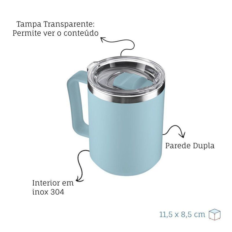 Caneca Térmica Café 450ml Com Tampa Aço Inox Parede Dupla AzulPrática, robusta e desenvolvida para o dia a dia, esta Caneca Térmica de 450ml é a companheira ideal para o seu trabalho ou momentos de lazer. Combinando um interior em Aço Inox 304 (qualidade alimentar) com um exterior resistente em Polipropileno (PP), ela garante a conservação da temperatura da sua bebida por mais tempo, seja ela quente ou fria, sem abrir mão da leveza.- Alta Capacidade (450ml): Tamanho generoso, ideal para quem gosta de grandes doses de café, chás ou água, evitando a necessidade de reabastecer constantemente.- Conservação Térmica Eficiente: O interior em Inox 304 não retém odores, preserva o sabor original da bebida e ajuda a manter a temperatura.- Segurança e Conforto: Exterior em plástico PP que oferece durabilidade e leveza. Conta com alça ergonômica desenhada para um manuseio confortável e seguro.- Tampa com Vedação de Encaixe: Ajuda a manter o calor (ou frio) dentro da caneca por mais tempo e previne respingos acidentais durante o transporte manual.- Fácil Higienização: Materiais de alta qualidade que facilitam a limpeza diária.Especificações do produto:Material: Interior em Aço Inox 304 / Exterior em Plástico PPCapacidade: 450mlDimensões: 11,5 cm (altura) x 8,5 cm (diâmetro)Peso: 0,170 kgPrática, robusta e desenvolvida para o dia a dia, esta Caneca Térmica de 450ml é a companheira ideal para o seu trabalho ou momentos de lazer. Combinando um interior em Aço Inox 304 (qualidade alimentar) com um exterior resistente em Polipropileno (PP), ela garante a conservação da temperatura da sua bebida por mais tempo, seja ela quente ou fria, sem abrir mão da leveza.- Alta Capacidade (450ml): Tamanho generoso, ideal para quem gosta de grandes doses de café, chás ou água, evitando a necessidade de reabastecer constantemente.- Conservação Térmica Eficiente: O interior em Inox 304 não retém odores, preserva o sabor original da bebida e ajuda a manter a temperatura.- Segurança e Conforto: Exterior em plástico PP que oferece durabilidade e leveza. Conta com alça ergonômica desenhada para um manuseio confortável e seguro.- Tampa com Vedação de Encaixe: Ajuda a manter o calor (ou frio) dentro da caneca por mais tempo e previne respingos acidentais durante o transporte manual.- Fácil Higienização: Materiais de alta qualidade que facilitam a limpeza diária.Especificações do produto:Material: Interior em Aço Inox 304 / Exterior em Plástico PPCapacidade: 450mlDimensões: 11,5 cm (altura) x 8,5 cm (diâmetro)Peso: 0,170 kg