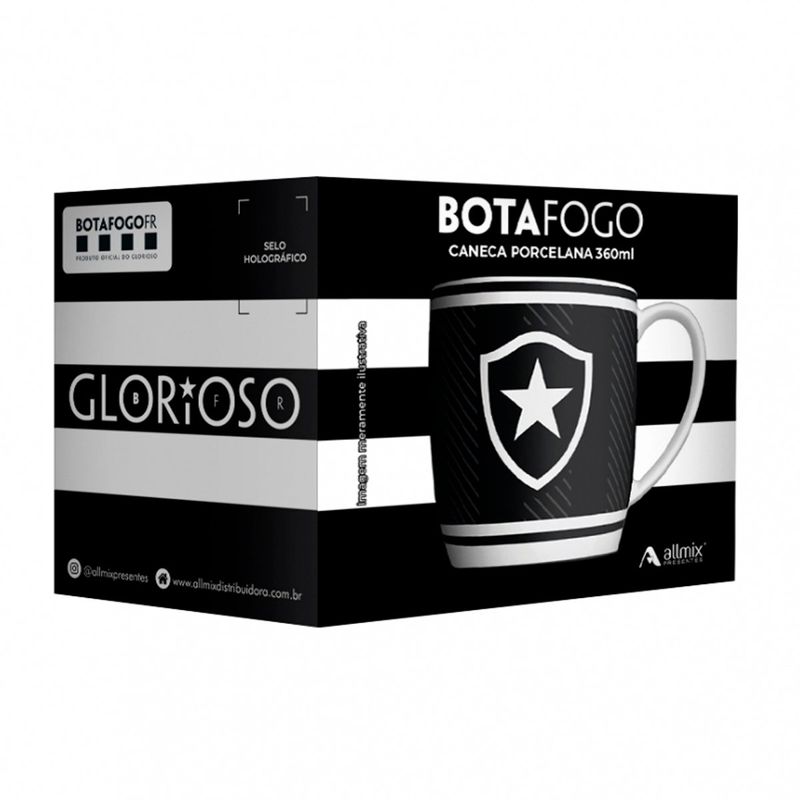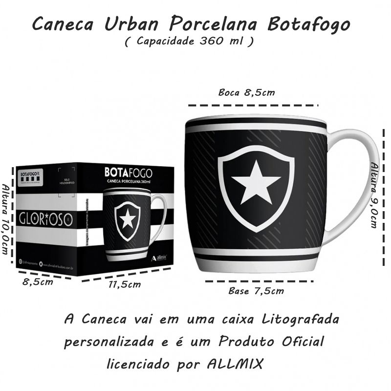 A Caneca Urban 360 ML Botafogo ? Luva com 1 unidade é um item essencial para os verdadeiros torcedores do Glorioso! Com design exclusivo e a emblemática identidade do Botafogo, essa caneca une estilo e funcionalidade, sendo perfeita para acompanhar seu café da manhã, chá da tarde ou até mesmo um chocolate quente enquanto torce pelo time. Fabricada com material resistente, é ideal tanto para uso próprio quanto para presentear um torcedor apaixonado.Caneca Urban Porcelana Allmix Brasao Botafogo 360 ML Licenciada BrancoTodas as informações divulgadas são de responsabilidade do fabricante/fornecedor.Marca: AllmixClassificação: Caneca TimesMaterial: Porcelana Conteúdo e Medidas: Caneca De Porcelana Urban Estampa - Brasão - Botafogo - 01 Peça.Tamanho Aproximado( Boca Ø 8,5cm - Altura 9,0cm - Base 7,5cm)Capacidade: 360mlA caneca vai em uma caixa Litografada personalizada e é um Produto Oficial licenciado.Benefícios do Produto:Design Exclusivo ? Estampa oficial do Botafogo, perfeita para mostrar o orgulho pelo clube em qualquer momento do dia.Material Resistente ? Feita com material de alta qualidade, garantindo durabilidade e resistência ao calor.Capacidade de 360ML ? Tamanho ideal para cafés, chás, chocolates quentes e outras bebidas.Perfeita para Presentear ? Um presente incrível para qualquer torcedor do Botafogo que quer demonstrar sua paixão pelo time.Produto Oficial e Licenciado ? Caneca 100% original, com selo de licenciamento oficial do clube.Fácil Higienização ? Material liso e resistente, facilitando a limpeza e preservando a estampa por mais tempo.Dica de uso e preservação:1 - Lavar com esponja macia e detergente neutro, seguido de pano limpo e seco.2 - Não utilizar produtos químicos ou abrasivos3 - Produto de vidro, manuseie com cuidado.4 - Choque e impactos podem provocar rachaduras ou quebras.Produto Original Oficial Licenciado por AllmixColeção / Sortimento: Clubes de FutebolEstampada: SimCor: BrancaReferencia: 441132Código de Barra: 7898919021833Garantia(Fabricante): Contra Defeito de FabricaçãoImagens Meramente IlustrativasINFORMAÇÕES IMPORTANTES: Item composto apenas por 01 Caneca em Porcelana Urban, os demais itens são meramente decorativos e NÃO fazem parte do conteúdo da embalagem.Aviso : - Todas as medidas são valores aproximados e podem sofrer alguma variação.- As cores podem sofrer uma pequena variação, dependendo do lote do produto e das configurações do seu computador.