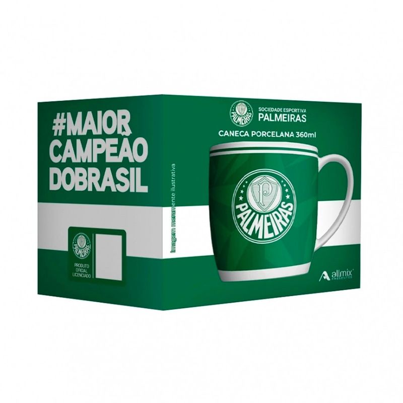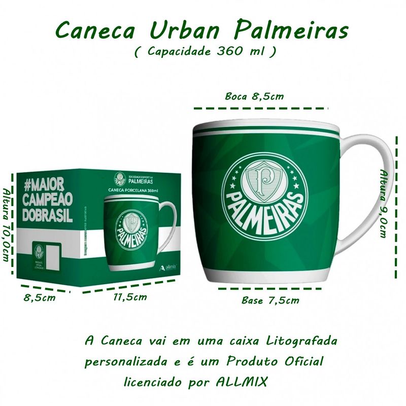 A Caneca Urban Palmeiras 360 ML é o item essencial para todo torcedor apaixonado pelo palmeiras. Com design moderno e acabamento premium, essa caneca é perfeita para tomar café, chá ou qualquer outra bebida enquanto exibe seu orgulho pelo time. Seja em casa, no escritório ou no dia a dia, essa caneca une funcionalidade e paixão pelo Palmeiras!Caneca Urban Porcelana Allmix Brasao Palmeiras 360 ML Licenciada BrancoTodas as informações divulgadas são de responsabilidade do fabricante/fornecedor.Marca: AllmixClassificação: Caneca TimesMaterial: Porcelana Conteúdo e Medidas: Caneca De Porcelana Urban Estampa - Brasão - Palmeiras - 01 Peça.Tamanho Aproximado( Boca Ø 8,5cm - Altura 9,0cm - Base 7,5cm)Capacidade: 360mlA caneca vai em uma caixa Litografada personalizada e é um Produto Oficial licenciado.Benefícios do Produto:Design Exclusivo ? Estampa oficial e moderna para torcedores que querem demonstrar seu amor pelo Palmeiras com estilo.Capacidade de 360 ML ? Tamanho ideal para apreciar suas bebidas favoritas, seja café, chá ou chocolate quente.Material Resistente e Durável ? Fabricada com materiais de alta qualidade, garantindo longa vida útil e resistência ao calor.Ótima Opção de Presente ? Ideal para presentear torcedores do Palmeiras em aniversários, datas comemorativas e eventos especiais.Produto Oficial e Licenciado ? Garantia de originalidade, perfeito para colecionadores e fãs do palmeiras.Fácil de Limpar ? Superfície lisa e resistente, facilitando a higienização e mantendo o brilho da estampa por muito mais tempo.Dica de uso e preservação:1 - Lavar com esponja macia e detergente neutro, seguido de pano limpo e seco.2 - Não utilizar produtos químicos ou abrasivos3 - Produto de vidro, manuseie com cuidado.4 - Choque e impactos podem provocar rachaduras ou quebrasProduto Original Oficial Licenciado por AllmixColeção / Sortimento: Clubes de FutebolEstampada: SimCor: BrancaReferencia: 441138Código de Barra: 7898919021895Garantia(Fabricante): Contra Defeito de FabricaçãoImagens Meramente IlustrativasINFORMAÇÕES IMPORTANTES: Item composto apenas por 01 Caneca em Porcelana Urban, os demais itens são meramente decorativos e NÃO fazem parte do conteúdo da embalagem.Aviso : - Todas as medidas são valores aproximados e podem sofrer alguma variação.- As cores podem sofrer uma pequena variação, dependendo do lote do produto e das configurações do seu computador.