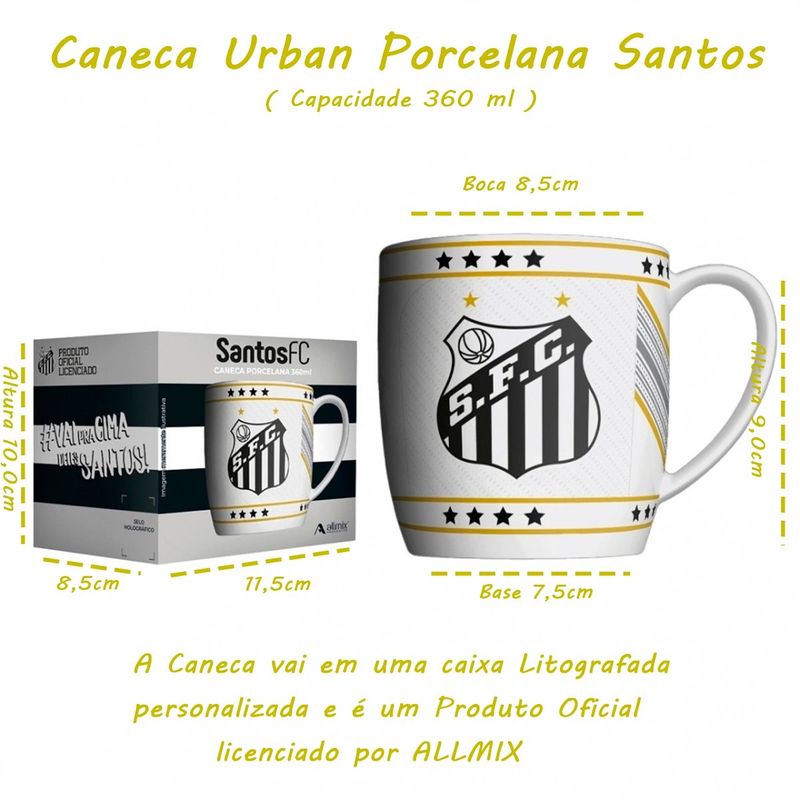 A Caneca Urban 360ML Santos ? Luva com 1 Unidade é o item perfeito para torcedores do Peixe que querem levar sua paixão pelo clube para o dia a dia. Com um design moderno e arrojado, essa caneca oficial combina resistência, estilo e funcionalidade, sendo ideal para momentos de café da manhã, trabalho ou presente para um verdadeiro santista.Caneca Urban Porcelana Allmix Brasao Santos 360 ML Licenciada BrancoTodas as informações divulgadas são de responsabilidade do fabricante/fornecedor.Marca: AllmixClassificação: Caneca TimesMaterial: Porcelana Conteúdo e Medidas: Caneca De Porcelana Urban Estampa - Brasão - Santos - 01 Peça.Tamanho Aproximado( Boca Ø 8,5cm - Altura 9,0cm - Base 7,5cm)Capacidade: 360mlA caneca vai em uma caixa Litografada personalizada e é um Produto Oficial licenciado.Benefícios do Produto: Design Exclusivo do Santos ? Caneca estilizada com o escudo e as cores do Peixe, ideal para torcedores apaixonados.Capacidade de 360ML ? Perfeita para servir café, chá, chocolate quente ou qualquer bebida favorita.Material Resistente e Durável ? Fabricada com materiais de alta qualidade que garantem maior durabilidade e preservação do design.Presente Perfeito ? Ótima opção para presentear amigos e familiares torcedores do Santos.Produto Oficial e Licenciado ? 100% original e certificado, garantindo autenticidade e exclusividade.Fácil de Limpar ? Superfície lisa que facilita a higienização e conserva a qualidade da caneca por mais tempo.Dica de uso e preservação:1 - Lavar com esponja macia e detergente neutro, seguido de pano limpo e seco.2 - Não utilizar produtos químicos ou abrasivos3 - Produto de vidro, manuseie com cuidado.4 - Choque e impactos podem provocar rachaduras ou quebras.Produto Original Oficial Licenciado por AllmixColeção / Sortimento: Clubes de FutebolEstampada: SimCor: BrancaReferencia: 441137Código de Barra: 7898919021888Garantia(Fabricante): Contra Defeito de FabricaçãoImagens Meramente IlustrativasINFORMAÇÕES IMPORTANTES: Item composto apenas por 01 Caneca em Porcelana Urban, os demais itens são meramente decorativos e NÃO fazem parte do conteúdo da embalagem.Aviso : - Todas as medidas são valores aproximados e podem sofrer alguma variação.- As cores podem sofrer uma pequena variação, dependendo do lote do produto e das configurações do seu computador.