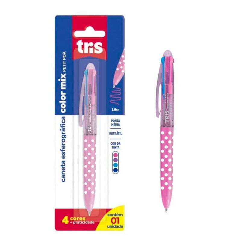 Caneta Esferográfica 4 Cores Color Mix Poá 1mm Unidade TrisA Caneta Esferográfica Color Mix Petit Poá da Tris combina praticidade e estilo em um único produto. Com quatro cores de tinta (azul clássico, azul claro, rosa e roxo) em uma única caneta, ela proporciona uma escrita super macia e cores vibrantes. O design com estampa de poá no corpo da caneta acrescenta um toque de charme, tornando-a ideal para quem busca uma caneta funcional e estilosa.Indicações de Uso:Escola: Perfeita para destacar notas, sublinhar textos e organizar o conteúdo com cores diferentes.Escritório: Ideal para anotações, agendas e organização de documentos.Uso Pessoal: Excelente para bullet journals, diários, e atividades criativas como desenhos e lettering.Presentes: Um ótimo presente para quem aprecia produtos de papelaria com estilo e funcionalidade.Composição:Resinas termoplásticasCorantesSolventesMetalReferência: 603032Tem alguma dúvida? Nossa equipe está pronta para ajudar no campo de perguntas ou via chat.