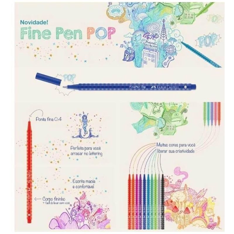 Caneta Fine Pen Pop 0.4mm com 05 Cores (Ref. SM/FPP5) Faber-Castell O Fine Pen Pop trás as cores que não podem faltar no seu dia a dia, Fine Pen 0.4 tem o traço mais fino e perfeito para contornos, escritas e desenhos. Com um design mais despojado e cheio de diferencial para seu estojo. - Ponta ultrafina de 0.4mm e a tinta que não passa para o outro lado da folha, suas anotações nunca mais serão iguais;- As canetas Fine Pen Pop são incríveis para escrever, contornar e desenhar, são perfeitas para lettering;- Corpo com design moderno e divertido que indicam a cor da tinta;- Formato redondo, fininho e leve que oferece maior conforto durante o uso;- Especialmente indicado para atividades que despertem e estimulem a criatividade, independente da idade, excelente para ilustrações, desenhos, cartazes e tudo o que a imaginação mandar;Embalagem com 05 canetasAtóxico e não perecível;Embalagem 100% reciclável;Imagens meramente ilustrativas, as cores podem variar em cada tela ou monitor.