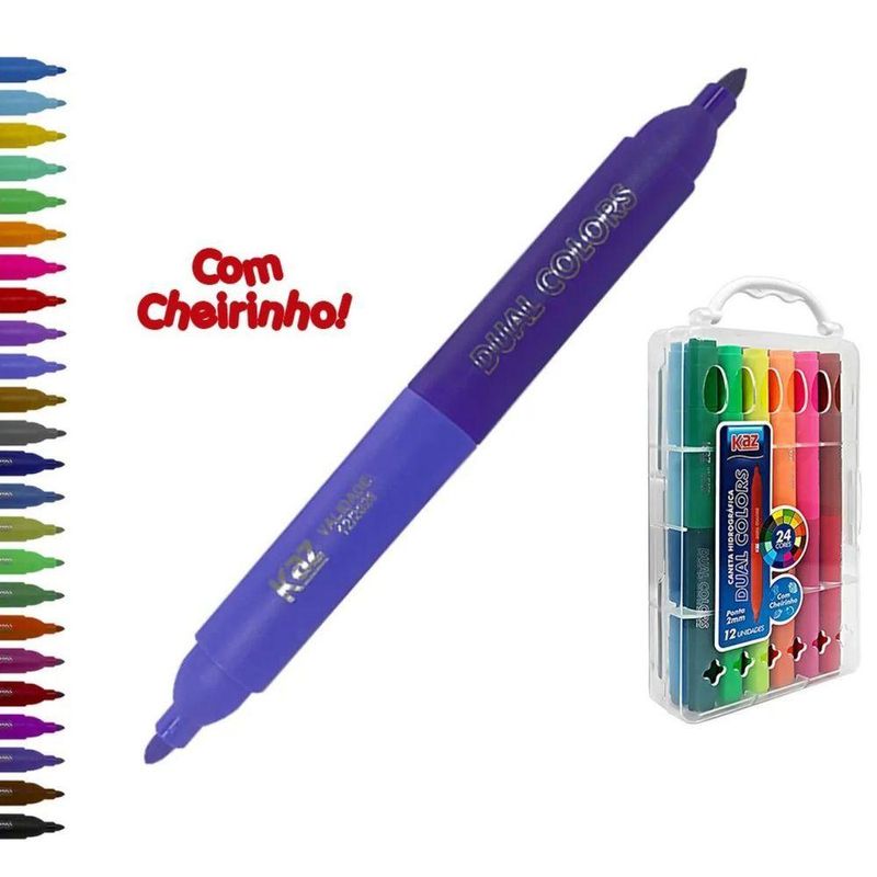 Caneta Hidrográfica Dual Color 24 Cores Aroma - Kz239 - KazCANETA HIDROGRÁFICA DUAL COLOR 24 CORES COM CHEIRINHO - KZ239 - KAZA caneta hidrográfica Kaz , é ideal para desenhar, pintar e trabalhos escolares.Tinta lavável, com ponta média de 2mm, tampa anti-asfixiante e cores vibrantes.Todas as cores tem um cheiro único e especial.12 canetas (24 cores)Dual colors (duas cores e cada caneta)Com cheirinhoPonta de 2mmINMETRO: OCP 0133 REGISTRO: 003288/2018