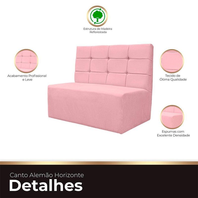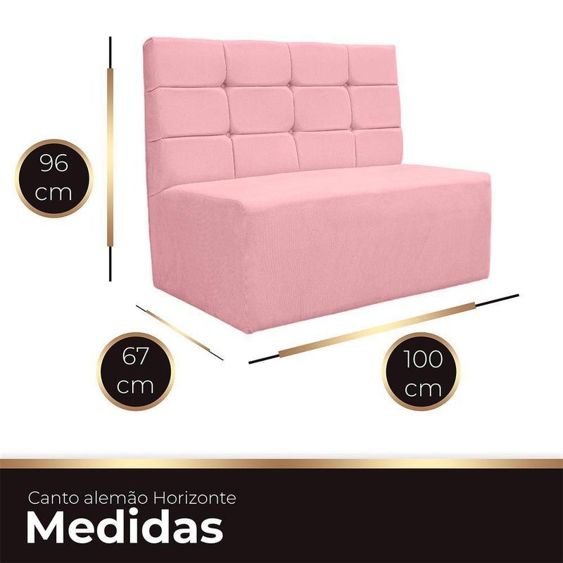 Canto Alemão Confortável Para Apartamento Cozinha E Restaurantes Veludo Cor Rosa BebeExplore um novo patamar de elegância com o Canto Alemão, uma peça estilosa, moderna e romântica,com detalhe em cortes no encosto no formato quadrado e com botões na cor do tecido, perfeita para otimizar espaços em apartamentos, cozinhas e restaurantes. Seu estofado confortável transforma qualquer ambiente em um convite ao relaxamento. Invista nesse móvel que une estilo e funcionalidade de maneira única, tornando cada momento ainda mais especial. Transforme seu espaço com a modernidade e charme do Canto Alemão.ESPECIFICAÇÕESEn;Revestimento: Tecido Veludo;Espuma: de alta densidade;DIMENSÕES DO CANTO ALEMÃOAltura total: 96cm;Largura total: 100cm;Profundidade total: 67cm;Peso: 16kg.A GARANTIA É DE FÁBRICA, mas também uma garantia que reflete nossa confiança no que fazemos.Ao escolher comprar conosco, você recebe não apenas um produto excepcional, mas também a tranquilidade de saber que estamos ao seu lado. Se, por qualquer motivo, seu produto apresentar algum problema nos próximos noventa dias, como fabricantes, estamos aqui para oferecer total assistência.Nossa prioridade é garantir que sua experiência de compra seja não apenas satisfatória, mas excepcional. Queremos que você tenha a certeza de estar negociando com uma empresa que valoriza, acima de tudo, a confiança mútua com seus clientes. Sua satisfação é a nossa maior recompensa.CUIDADOS COM A LIMPEZAUtilizar um pano limpo e seco. Não limpar com produtos abrasivos ou escovas. Não deixar exposta à luz do sol diretamente pois isso irá diminuir a vida útil do produto, fazendo-o envelhecer precocemente. Este produto não é recomendado para ambientes externos onde possa receber chuva.MONTAGEM- O Canto alemão chegara montado.INFORMAÇÕES IMPORTANTES- Todos os produtos vão embalados com total segurança;-;- Objetos decorativos que aparecem na foto não acompanham o produto;- Pode haver alguma diferença de tonalidade entre a imagem e o produto real, por conta do tratamento de imagens e a calibração de cores do seu monitor;- Por se tratar de estofado as medidas podem ter uma pequena variação em até 3 cm;- Confira as dimensões do produto e certifique-se de que passará normalmente por supostos elevadores, portas, escadas e/ou corredores de sua residência, ;- Havendo despesas adicionais, serão de responsabilidade do cliente.