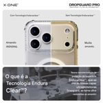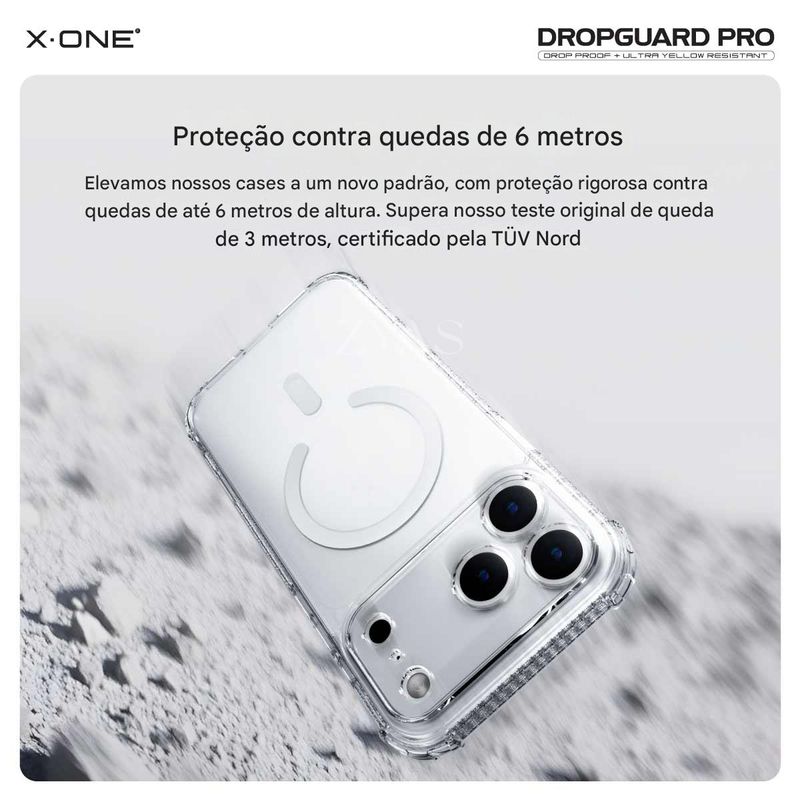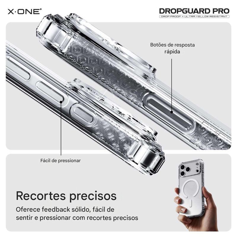 DropGuard Case Pro Magnetic X-ONE | Proteção Máxima com Estilo e Tecnologia MagSafe A DropGuard Case Pro Magnetic da X-ONE foi desenvolvida para quem exige proteção de alto nível, praticidade e design elegante. Com tecnologia avançada e compatibilidade total com MagSafe, ela garante que o seu iPhone esteja sempre protegido — sem abrir mão do estilo e da funcionalidade. Proteção Incomparável DNA Guard™ – Estrutura interna que absorve e dissipa o impacto de quedas, mantendo seu iPhone seguro. Airbags Anti-Impacto – Bordas reforçadas com airbags que protegem os pontos mais vulneráveis contra choques. Proteção para câmera – Bordas elevadas ao redor das lentes, evitando arranhões e desgastes diários. Design Elegante e Funcional Carregamento MagSafe integrado – Ímãs embutidos que garantem encaixe preciso e recarga rápida, sem comprometer a segurança. Revestimento EnduraClear™ – Camada exclusiva que evita o amarelamento, mantendo a capa transparente por muito mais tempo. Recortes precisos – Encaixe perfeito, com acesso fácil a todos os botões, portas e funções do iPhone. Ultrafina e leve – Protege sem adicionar volume extra ao aparelho. Benefícios Extras 1 ano de garantia X-ONE – Segurança e confiança no seu investimento. Compatível com carregamento sem fio – Use sem precisar remover a capa. Durabilidade premium – Fabricada com materiais resistentes a riscos e desgaste do dia a dia. Resumo: A DropGuard Case Pro Magnetic X-ONE não é apenas uma capa — é uma blindagem inteligente para o seu iPhone. Com proteção avançada, design sofisticado e tecnologia MagSafe, ela entrega o equilíbrio perfeito entre segurança, praticidade e estilo.