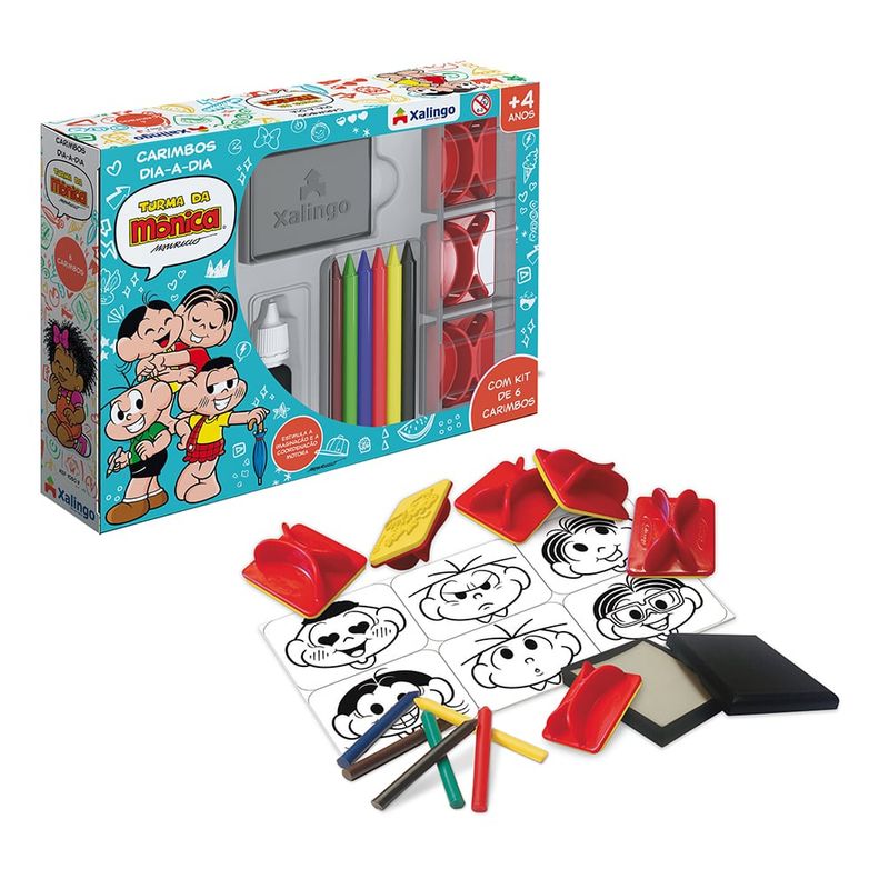 Brincar com carimbos nunca ficou tão divertido! Com os Carimbos Dia a Dia Turma Da Mônica da Xalingo Brinquedos, a brincadeira está garantida! Conta com 6 carimbos diferentes, de cabo plástico e borracha atóxica. Acompanha 1 almofada para carimbo, 1 frasco de tinta atóxica, 1 bloco de papel e giz de cera para colorir as imagens carimbadas durante a brincadeira. Desenvolve a coordenação motora e as habilidades de identificar, desenhar, pintar, criar e contar histórias a partir de cenários com os seus personagens favoritos da turminha! É pura diversão! DADOS TÉCNICOS Marca: Xalingo Referência: 1050.9 Idade Recomendada: +4 Anos Dimensões aproximadas da embalagem: 24 x 18 x 05 CM Código de Barras: 7896640410506 Material: Plástico Produto Certificado Inmetro OCP 0006 REGISTRO N: 006476/2020 Garantia: Contra Defeitos de Fabricação Todas as informações divulgadas são de responsabilidade do fabricante/fornecedor. Imagens Meramente Ilustrativas. Observe atentamente a idade recomendada para o brinquedo. Pode conter partes pequenas que podem ser engolidas e perigosa. A Jéssica Presentes está no mercado a mais de 20 anos, com a missão de proporcionar um ótimo atendimento aos seus clientes, sempre em busca de novidades na área de brinquedos e papelaria.