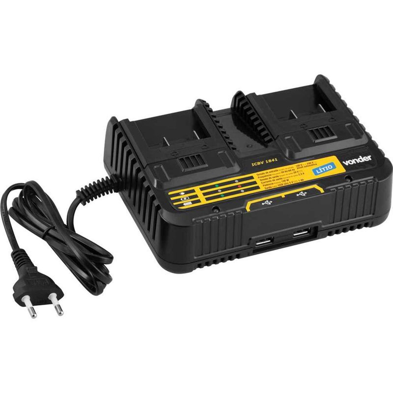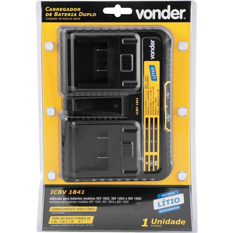 Carregador de Bateria Duplo, 18 V, Linha Intercambiável, Carregamento Convencional, Icbv 1841, Vonder OstenVonder - Conteúdo da embalagem: 1 Carregador de bateria. Aplicação: Indicado para carregar as baterias da linha intercambiável VONDER, modelos:(2 Ah) IBV 1802 - 60.04.180.200(4 Ah) IBV 1804 - 60.04.180.400(5 Ah) IBV 1850 - 60.04.185.000(8 Ah) IBV 1880 - 60.04.188.000Carregador com carregamento convencional. Destaques: Possibilita o carregamento simultâneo de duas baterias. Conta ainda com duas saÃdas USB 5V - 1A, possibilitando o carregamento de smartphones, por exemplo. Além de bivolt automático e LEDs indicadores de carregamento. Referência: 6004184100 Garantia - E (CDC): Garantia legal: 90 dias + Garantia contratual: 9 meses Modelo: ICBV 1841 Tensão de entrada do carregador de baterias: 100 V~ - 240 V~ - bivolt automático Tipo: Carregamento convencional Tensão de saÃda do carregador de bateria: 20 V Corrente de saÃda do carregador de bateria: 2,3 A Massa aproximada (peso): 0,780 kg Tempo de carregamento: Bateria de 2,0Ah - 60 minutos; Bateria de 4,0Ah - 120 minutos; Bateria de 5,0Ah - 140 minutos; Bateria de 8,0Ah - 190 minutos Observação: Indicado para carregar as baterias da linha intercambiável VONDER, modelos: (2 Ah) IBV 1802 - 60.04.180.200/112.30.60 (4 Ah) IBV 1804 - 60.04.180.400/112.30.61 (5 Ah) IBV 1850 - 60.04.185.000/116.50.93 (8 Ah) IBV 1880 - 60.04.188.000/117.80.60. Carregador com carregamento convencional. Frequência: 50 Hz / 60 Hz Destaques Comercial: Permite carregar duas baterias simultaneamente, possui duas saÃdas USB 5V-1A, bivolt e LEDs indicadores. Aplicação Comercial: Carregador indicado para baterias VONDER intercambiáveis de 2 Ah a 8 Ah, com carregamento convencional. Características Gerais do Produto: Garantia: • 3 Meses