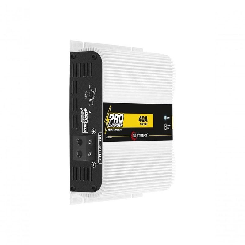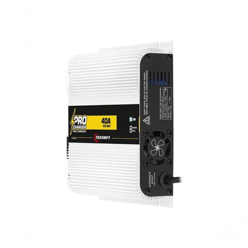 Carregador De Baterias Taramps Pro Charger 40a 0,93kvaApresentamos a Pro Charger 40A. Esta fonte e carregador de baterias bivolt (127/220V AC), possui ajuste de tensão variável (12V DC a 14.4V DC) e indicador de carga completa. Capaz de fornecer até 40 Amperes, pode ser usada como: Carregador de baterias, fonte de alimentação, auxiliar para sistemas de som automotivo, entre outras. *Imagens meramente ilustrativas. ALIMENTAÇÃO: Bivolt Automático (127/220VAC)FAIXA DE TENSÕES EM REDE 127V: 100 ~ 140V ACFAIXA DE TENSÕES EM REDE 220V: 200 ~ 240V ACCORRENTE NOMINAL MÁX. DE SAÍDA: 40APOTÊNCIA MÁXIMA DE SAÍDA: 560WEFICIÊNCIA: 90%CONSUMO MÁX. EM REDE 127V: 11ACONSUMO MÁX. EM REDE 220V: 09AFLUTUAÇÃO MÁXIMA EM PLENA CARGA: