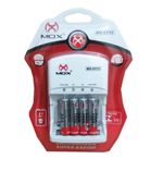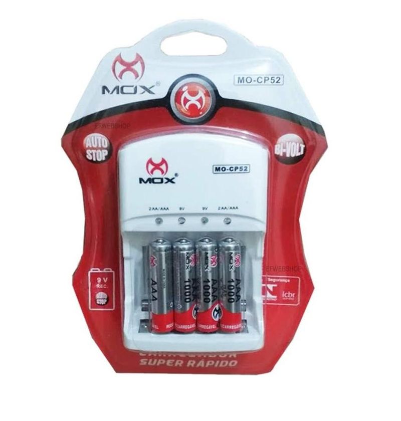 CARREGADOR COM PLUG ARTICULADO MELHOR ENCAIXE EM TOMADAS COM OUTROS EQUIPAMENTOSSELO DE QUALIDADE E PROCEDÊNCIA IN METRO KIT CARREGADOR COM 4 PILHAS RECARREGÁVEIS MOX AAA 1000 mahCARREGADOR DE PILHAS E BATERIAS MOX CP 50 CARREGA 4 PILHAS RECARREGÁVEIS AA OU 4 AAA OU 2 BATERIAS DE 9V;ESTE CARREGADOR CONTÉM LUZ DE LED INDICANDO O PROCESSO DE CARGA; ACENDE OS LEDS LATERAIS AO COLOCAR AS PILHAS, O LEDS CENTRAIS ACENDEM AO COLOCAR BATERIA DE 9V PARA CARREGAR.DESLIGA AUTOMATICAMENTE QUANDO A CARGA ESTÁ COMPLETA VIDE TABELA ABAIXOConsiderar este tempo para 4 pilhas ou 1 bateria 9vAA 1000-1300 de 10h a13hAA 1300-2000 de 10h a 16hAA 2100-2600 de 10h a 19hAAA 500-600 de 10h a 15hAAA 600-800 de 10h a 18hAAA 900-1100 de 10h a 20h9V 110-120 de 10h a 14h9V 150-160 de 10h a 16hBI-VOLT: 110 / 220V AUTOMÁTICO CARREGADOR SUPER RÁPIDO !!!! ENTRADA AC 110/220-50/60HZ 100ma SAÍDA DC 2.4V 400 m A AA DC 2.4V 400 m A AAA DC 9.0V 35 m A 9VContém :1 - Kit COM 4 PILHAS MOX AAA 1000 MAH 1,2V NI-MH RECARREGÁVEL ORIGINAL MOX+ 1 - CARREGADOR MOX CP50 ORIGINAL MOXPILHAS DE EXCELENTE QUALIDADE E DURABILIDADE E RESISTÊNCIA EM DIVERSOS APARELHOS QUE NECESSITAM DE PILHAS DE ALTA AUTONOMIA.IDEAL PARA BRINQUEDOS EM GERAL, CONTROLE DE VIDEO GAMES RELOGIOS DE PAREDES E EM TODOS TIPOS DE EQUIPAMENTOS QUE NECESSITEM DE UMA PILHA DURADOURA E DE QUALIDADE.