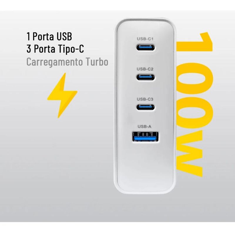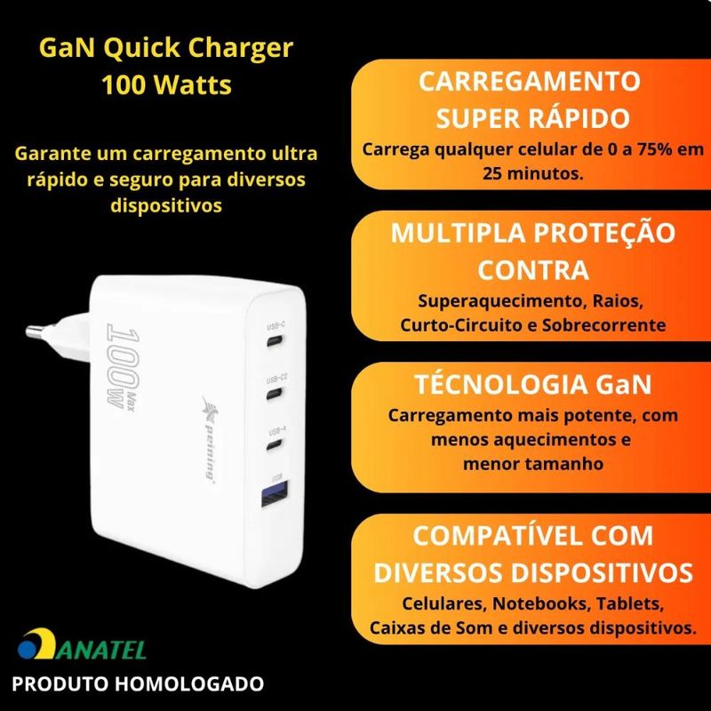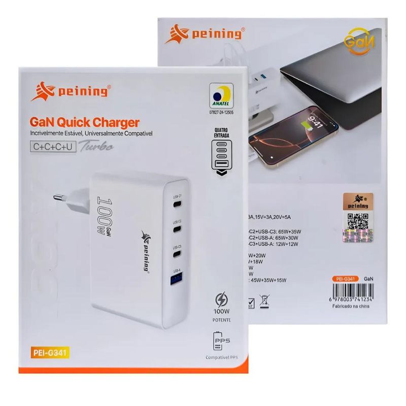A Peining eleva o padrão com a integração da tecnologia de ponta GaN (Nitreto de Gálio) neste carregador. O GaN permite que este dispositivo entregue uma potência impressionante de 100W em um tamanho que desafia as expectativas, sendo muito menor, mais leve e mais eficiente que os carregadores tradicionais de silício. Isso se traduz em menos calor, maior vida útil do produto e, o mais importante, carregamentos ultra rápidos e seguros para todos os seus aparelhos. Com quatro portas de saída (3x USB-C e 1x USB-A), o PEI-G341 é a solução perfeita para carregar múltiplos dispositivos de alta demanda simultaneamente, eliminando a bagunça de vários adaptadores.Principais Características e Vantagens: - Potência Turbo 100W: Carregamento ultrarrápido para notebooks e dispositivos que exigem a máxima energia.- Proteção Multicamadas: Segurança avançada contra sobrecarga, superaquecimento, curto-circuito, sobretensão e sobrecorrente, protegendo seus valiosos equipamentos. - Quatro Saídas Inteligentes (C+C+C+U): 3 portas USB-C e 1 porta USB-A para carregar até quatro dispositivos simultaneamente com distribuição de energia otimizada. - Eficiência GaN: Tecnologia de Nitreto de Gálio para um carregador menor, mais leve, mais frio e mais eficiente.- Compatibilidade Universal PPS: Carregamento otimizado para uma vasta gama de dispositivos que suportam a tecnologia Programmable Power Supply.- Controle Térmico Superior: Gerenciamento inteligente de temperatura para um funcionamento seguro e prolongado. Entenda a Tecnologia por Trás do Seu Carregador Premium: - GaN (Nitreto de Gálio): Um composto semicondutor de última geração que substitui o silício, permitindo a fabricação de carregadores significativamente menores, mais eficientes energeticamente, com menor geração de calor e capacidade de lidar com potências muito maiores. - PPS (Programmable Power Supply): Uma funcionalidade avançada do padrão USB Power Delivery (PD) que permite ao carregador ajustar finamente a tensão e a corrente de saída em tempo real. Isso significa um carregamento mais rápido, seguro e eficiente, adaptado precisamente às necessidades de cada dispositivo conectado. - Volts (V): A unidade de medida da "tensão elétrica", que é a força que impulsiona a corrente elétrica.- Amperagem (A): A unidade de medida da "corrente elétrica", que indica a quantidade de carga elétrica que flui por segundo.- Carga de Saída (Output): A energia (potência, em Volts e Amperes) que o carregador entrega aos seus dispositivos.- Carga de Entrada (Input): A energia (potência, em Volts e Amperes) que o carregador recebe da tomada elétrica.Ficha Técnica Detalhada (PEI-G341):Modelo: PEI-G341 Material: Plástico ABS de alta qualidade e componentes eletrônicos avançados.Entrada (Input): AC 100-240V ~ 50/60Hz, 2A Máx.Saída Total Máxima: 100W Saída (Output) - USB-C1 / USB-C2 / USB-C3 (individual): 5V/3A, 9V/3A, 12V/3A, 15V/3A, 20V/5A (100W Máx.) PPS: 3.3-11V/5A, 3.3-21V/5ASaída (Output) - USB-A (individual): 5V/3A, 9V/3A, 12V/2.5A (30W Máx.)Saídas Combinadas (Distribuição Inteligente de Potência): USB-C1 + USB-C2: 65W + 30W USB-C1 + USB-C3: 65W + 30W USB-C2 + USB-C3: 65W + 30W USB-C1 + USB-A: 65W + 30W USB-C2 + USB-A: 65W + 30W USB-C3 + USB-A: 65W + 30W USB-C1 + USB-C2 + USB-C3: 45W + 30W + 20W USB-C1 + USB-C2 + USB-A: 45W + 30W + 18W USB-C1 + USB-C3 + USB-A: 45W + 30W + 18W USB-C2 + USB-C3 + USB-A: 45W + 30W + 18W USB-C1 + USB-C2 + USB-C3 + USB-A: 45W + 30W + 15W Cores Disponíveis: BrancoConteúdo da Embalagem:1x Carregador de Parede Peining GaN Quick Charger Turbo 100W (Modelo PEI-G341)Selos e Certificações: ANATEL: Certificação 07827-24-12505CE FC RoHS: Conformidade com os mais altos padrões de segurança, qualidade e responsabilidade ambiental.Produto Não Perecível: Garantia de um produto durável e confiável.Eleve sua produtividade e liberte-se de carregadores volumosos! Adquira já o seu Carregador GaN Quick Charger Turbo 100W Peining PEI-G341 e experimente a potência e a conveniência que você merece!