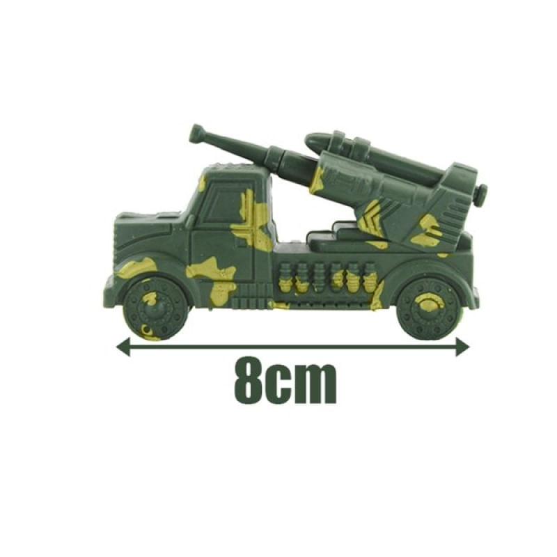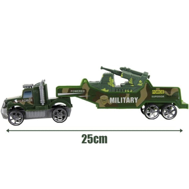 Carreta a Fricção Militar Camuflado Verde Carro - Conteúdo da embalagem: 01 Caminhão de carga - Altura:5cm x Largura: 4,5cm x Comprimento:25cm 01 Carro - Comprimento:8cm Ficha técnica: Material: Plástico abs. Características Gerais do Produto: Garantia: • Garantia do site - 1 Mês