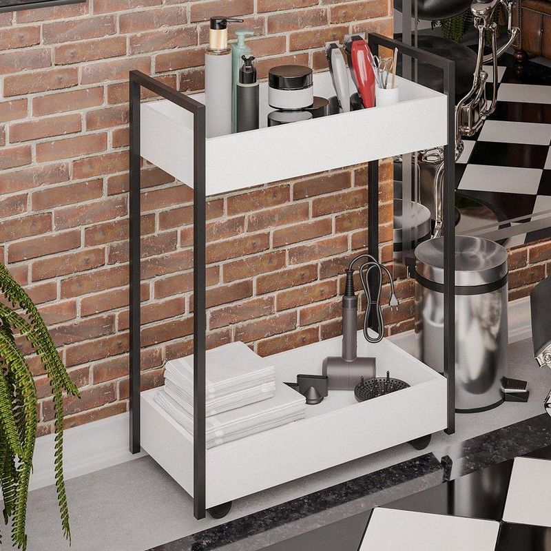 Carrinho Auxiliar Para Salão De Beleza Industrial Sara M24 Branco/preto - MpozenatoUm organizador tão versátil quanto o Carrinho Auxiliar para Salão de Beleza Industrial Sara M24 Branco/Preto, da Mpozenato, não há. Projetado para atender as mais diversas necessidades, esse organizador com rodinhas vai facilitar a sua rotina, além de oferecer solução inteligente de armazenamento e organização.O design estilo industrial adiciona um toque de modernidade, ao passo que as rodinhas potencializam a funcionalidade, já que fica mais prático a movimentação dos itens. Seja como carrinho auxiliar para estética ou salão de beleza, seja como organizador de banheiro ou até mesmo como multiuso para lavanderia. Não importa a finalidade, já que esse carrinho organizador 2 caixas pode servir para todas essas opções e quantas mais você desejar, afinal, versatilidade é o atributo que melhor define essa peça.Então, não espere mais e aproveite para adquirir o seu carrinho multiuso hoje mesmo. Você vai se surpreender!Dimensões do ProdutoLargura: 70 cm.Altura: 94 cm.Profundidade: 35 cm.Peso: 16 kg.Altura das Caixas: 12 cm.Características do ProdutoMaterial da estrutura: MDP BP/Aço Carbono.Acabamento: Melamina BP.Escala de Brilho: Fosco.Peso Suportado: 25 kg distribuídos.Quantidade de Prateleiras: 2 Prateleiras Caixa.Tipo dos Pés: Rodízios.Diferenciais:- Design moderno, estilo industrial.- Carrinho multiuso para diversos ambientes.- Rodízios para melhor mobilidade e versatilidade.- Estrutura de aço carbono 20x20 com pintura eletroestática.Sistema de Montagem: Parafusos.Manual de Montagem: Sim.Complexidade da Montagem: Baixa.Volumes: 1 Volume.Conteúdo da Embalagem: 1 Carrinho Multiuso.Garantia do Fabricante: 90 dias contra defeito de fabricação.Montagem: Recomendamos que seja feita por um profissional.Recomendação de Limpeza: Utilize pano levemente úmido.Observações importantes- Produto para uso residencial em ambiente interno, não devendo ficar exposto diretamente ao sol, calor e umidades excessivas.- Pode haver alguma diferença de tonalidade entre a imagem e o produto real, por conta do tratamento de imagens e a calibração de cores do seu monitor.- As imagens são meramente ilustrativas, não acompanham objetos de decoração e eletrônicos.- Confira o estado da embalagem, não devendo assinar o comprovante em caso de danos.- Não asseguramos, no ato da entrega, por subir escadas/elevadores, pelo transporte por guincho em apartamentos ou montagem, desmontagem e instalações. Eventuais despesas são por conta do comprador.- Confira as dimensões do produto e certifique-se de que passará normalmente por supostos elevadores, portas, escadas e/ou corredores de sua residência.