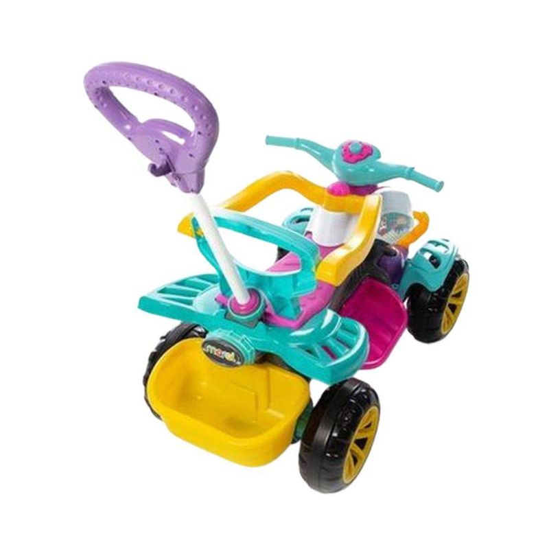Quadriciclo Infantil Carrinho de Passeio Moto com Haste ============================================================ Contém: 01 Unidade Especificações: - Material: Plástico Adesivos e Borracha - Medida: 51cm x 92cm - Porta Objetos - Pedal para brincar sozinho - Rodas Emborrachadas - Anel de Limitação dos Pés - Encosto e Acento Ergonômico - Proteção Lateral - Haste para Guiar e Segurança - Peso: 7000 gramas - Cor: Colorido Variado * ATENÇÃO * Não indicado para crianças menores de 09 meses. ============================================================ Devido à diferença entre monitores e iluminação diferentes, pode haver variação na tonalidade apresentada no anúncio. Medidas muito aproximadas.