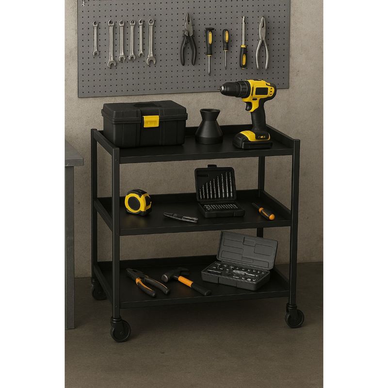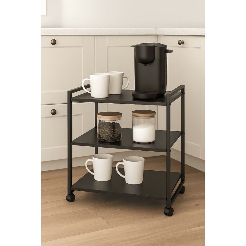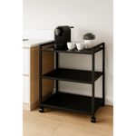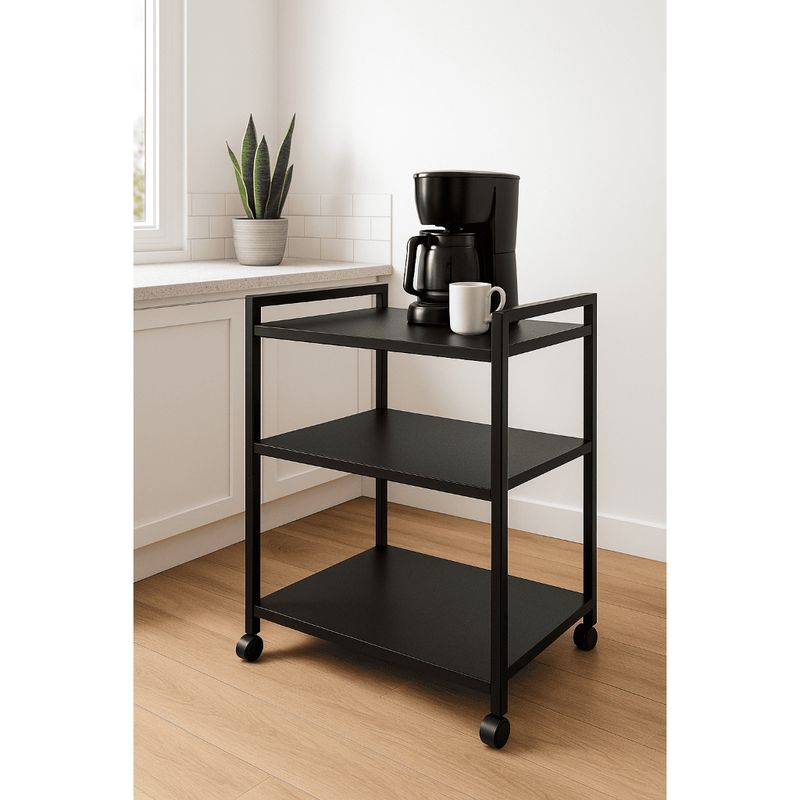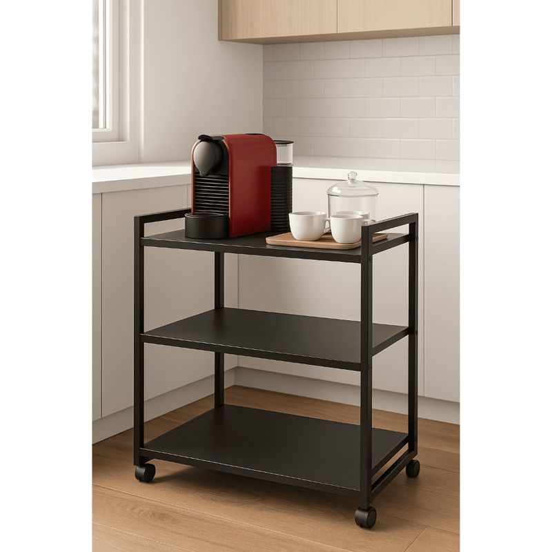 Carrinho de café/chá bar e aparador e buffet é ideal para eventos e espaços modernos. Versátil e multifuncional, se adapta a diversas necessidades. Perfeito para servir café em ambientes como residências, escritórios e eventos. Possui 4 rodízios que garantem mobilidade fácil.Medidas:Altura: 79cmLargura: 70cmProfundidade: 45cmCor: PretoSuporta até 10kg por prateleiraMaterial Da Estrutura: MetalonMaterial Da Prateleira: MDP