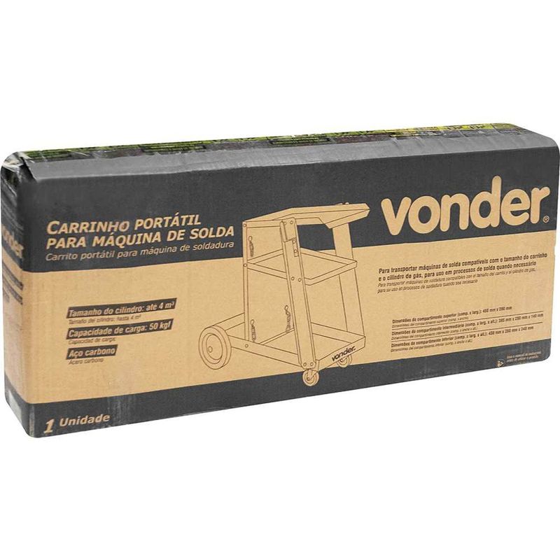 Carrinho Portátil Para Máquina de Solda Vonder - Conteúdo da embalagem: 1 Carrinho portátil. Aplicação: Indicado para transportar máquinas de solda e cilindro de gás de até 4 m³ compatÃveis com o tamanho do carrinho, para uso em processos de solda, quando necessário. Destaques: Proporciona praticidade e organização na movimentação dos equipamentos de solda. Referência: 6160000050 Garantia - E (CDC): Garantia legal: 90 dias Material: Aço carbono Capacidade de carga: 50 kgf Massa aproximada (peso): 12,8 kg Dimensões totais: C x L x A: 700 mm x 395 mm x 710 mm Dimensões do compartimento superior: C x L: 450 mm x 280 mm Destaques Comercial: Proporciona praticidade e organização na movimentação dos equipamentos de solda. Aplicação Comercial: Transporte de máquinas de solda e cilindro de gás até 4 m³ compatÃveis com o carrinho para uso em soldagem. Características Gerais do Produto: Garantia: • 3 Meses