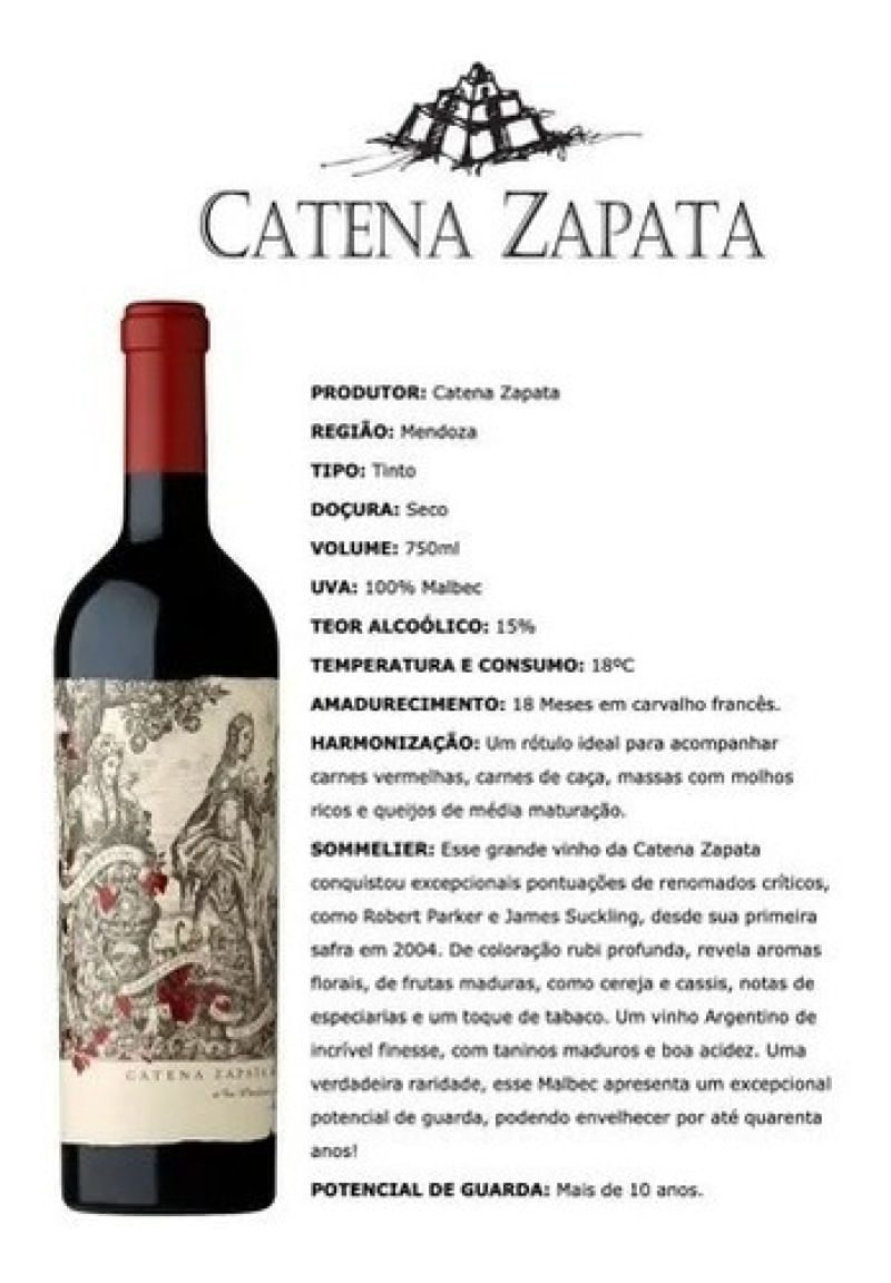 Descubra a Elegância do Vinho Catena Zapata Malbec Argentino - Safra 2021Explore o autêntico sabor da Argentina com o prestigioso Vinho Catena Zapata Malbec Argentino - Safra 2021! Originário de Mendoza, essa joia vinífera captura a essência única da região e oferece uma experiência sensorial incomparável.Características Principais:Tipo: TintoVariedade: 100% MalbecTeor alcoólico: 14%Safra: 2021Região de Origem: Mendoza, ArgentinaAromas Envolventes:Deixe-se seduzir pelos aromas fascinantes deste Malbec refinado. Descubra notas florais, frutas maduras como cereja e cassis, além de uma sutileza de especiarias e um toque envolvente de tabaco. Uma sinfonia de fragrâncias que despertará seus sentidos a cada taça.Harmonização Perfeita:Este vinho é o parceiro ideal para apreciadores de carnes vermelhas. Desfrute de momentos únicos de prazer gastronômico ao combinar este Malbec com suculentos bifes, churrascos ou pratos intensos.Especificações da Garrafa:Volume: 750mlDesign elegante e rótulo exclusivo, refletindo a qualidade excepcional do conteúdo.Por que escolher o Catena Zapata Malbec Argentino?Ao adquirir este vinho, você está investindo não apenas em uma bebida, mas em uma tradição de qualidade e excelência. A renomada vinícola Catena Zapata é sinônimo de prestígio e dedicação à arte vinícola, proporcionando uma experiência única em cada gole.Não perca a oportunidade de elevar seus momentos especiais com o Vinho Catena Zapata Malbec Argentino - Safra 2021. Reserve sua garrafa agora e deixe-se envolver pela magia desta joia vinífera argentina! Gentileza notar: O EXCESSO DE ÁLCOOL É PREJUDICIAL À SAÚDE. AS BEBIDAS ALCOÓLICAS DEVEM SER CONSUMIDAS COM MODERAÇÃO E SUA VENDA É PROIBIDA PARA MENORES DE IDADE.