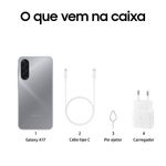 Samsung Galaxy A17 – O primeiro Galaxy A com Inteligência Artificial! O Samsung Galaxy A17 4G chega com design fino e acabamento moderno, oferecendo desempenho e recursos de ponta para o dia a dia. É o primeiro Galaxy A com Inteligência Artificial, trazendo as experiências do Gemini Live e o recurso Circule para Pesquisar que tornam a interação mais fluida e inteligente. Tela 6.7” Equipado com tela Super AMOLED de 6.7" e resolução FHD+, o Galaxy A17 proporciona cores vibrantes e excelente brilho mesmo sob luz intensa. Câmeras A câmera traseira tripla de até 50MP com estabilização óptica (OIS) garante fotos e vídeos com nitidez impressionante, enquanto a câmera frontal de 13MP perfeita para selfies detalhadas. Processador Com processador MediaTek Helio G99 Octa-Core e 8GB de RAM, o desempenho é fluido, permitindo navegar, jogar e multitarefar sem travamentos. Armazenamento O armazenamento interno de 256GB é expansível até 2TB via cartão MicroSD, oferecendo espaço de sobra para fotos, vídeos e aplicativos. Resistência e Bateria Além da performance, o Galaxy A17 entrega durabilidade com resistência à água e poeira (IP54). A bateria de 5000mAh mantém o ritmo por muito mais tempo, com carregamento rápido e eficiente. Conectividade Com Samsung Wallet para pagamentos seguros, leitor biométrico, suporte a Bluetooth, Wi-Fi, NFC e GPS, o Galaxy A17 é completo em todos os detalhes — unindo estilo, inteligência e performance na palma da mão. Android 15 Sistema Operacional Android 15.0, One UI 7.0 com até 6 versões de atualizações e 6 anos de segurança. Descubra mais produtos e inovações Samsung e aproveite todas as novidades agora mesmo!