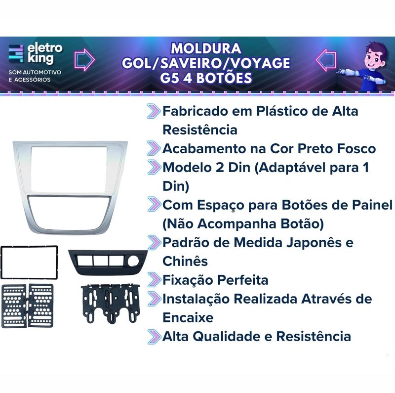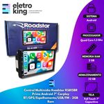 Central Multimídia 7" Roadstar Android RS815BR + Moldura Prata Gol/Saveiro/Voyage G5 4 Botões + Câmera de Ré Dinâmica RS203 Transforme o interior do seu carro com a Central Multimídia Roadstar RS815BR de 7” com Android, que oferece tela touch, conectividade completa e muito mais tecnologia no dia a dia, junto da moldura prata específica para Gol/Saveiro/Voyage G5 (4 botões) garantindo encaixe perfeito e acabamento original, além da câmera de ré dinâmica RS203 que facilita manobras com mais segurança e praticidade Especificações Técnicas: Central Multimídia 7" Roadstar Android RS815BR Prime • Sistema: Android • Processador: Quad Core 1.3 Ghz • Memória RAM: 2 Gb • Memória FLASH: 32 Gb • Painel: Fixo com botões touch e iluminação RGB • Tela: Vidro Full Touch IPS 7" Capacitiva • Rádio: FM com memória para 18 estações FM • Conexões: Bluetooth, WiFi e GPS (Acompanha Antena) • Entradas traseiras: 2 Vídeo Auxiliar, 2 RCA (Audio), 1 Câmera de Ré, 2 USB´s (USB e USB-C) e Microfone Externo (Acompanha Microfone) • Saídas: 2 RCA (Audio) e 2 RCA (Vídeo) • Comando de Volante: SIM (em alguns modelos de carros poderá ser necessário o uso de interface) • Potência: 4 Canais de 50 Watts RMS Moldura 2 Din Gol/Voyage/Saveiro G5 c/suporte Prata • Fabricado em Plástico de Alta Resistência • Acabamento na Cor Prata • Modelo 2 Din (Adaptável para 1 Din) • Com Espaço para Botões de Painel (Não Acompanha Botão) • Padrão de Medida Japonês e Chinês • Fixação Perfeita • Instalação Realizada Através de Encaixe • Alta Qualidade e Resistência • Acompanha Moldura Redutora para Acabamento Camera De Ré Roadstar Dinâmica Tipo Borboleta - RS203BR • Modelo: Borboleta 2x1 • Tipo: Câmera de Ré • Angulo de visão: 120º • Linhas de Estacionamento: Dinâmica • Sensor: CMOS de Alta Sensibilidade • Sistema de vídeo: NTSC/PAL • Voltagem: 10v-15v (12v no carro) • Temperatura de trabalho: -20ºC - +70ºC • Resistente a água: IP67 - IP68 • Resolução: 480p Conteúdo da Embalagem: • 01 Central Multimídia Roadstar RS815BR Prime Android 7 Pol • 02 Chicotes de Instalação • 01 Moldura Gol/Voyage/Saveiro G5 • Suportes de Instalação • 01 Câmera De Ré Roadstar Dinâmica • Manual e Certificado de Garantia Importante: • Garantia de 273 Dias. • Valor do Kit.