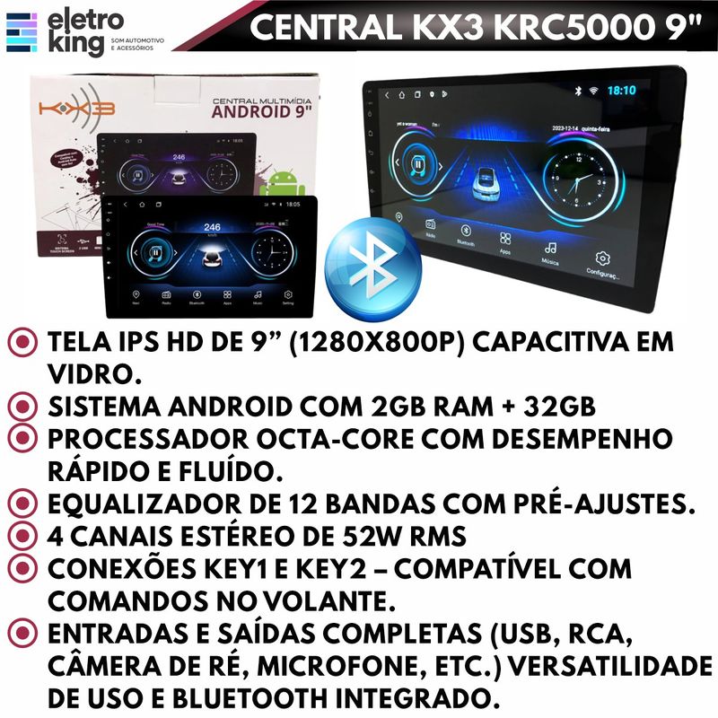 Central Multimídia KX3 KRC5000 Android 9" Octacore Carplay BT/GPS/Espelhamento/USB/FM - 2GB Ram Central Multimídia KX3 KRC5000 com tela de 9 polegadas e sistema Android, equipada com processador Octa-Core e 2GB de RAM, proporcionando navegação rápida e desempenho eficiente. Conta com CarPlay e espelhamento para maior integração com o smartphone, além de Bluetooth para chamadas e músicas sem fio, GPS integrado para rotas precisas, entrada USB e rádio FM. Uma solução completa que une tecnologia, conectividade e praticidade para transformar a experiência dentro do seu veículo. Especificações Técnicas: • Marca: KX3 • Modelo: KRC5000 • Sistema Operacional: Android • 2GB de RAM • 32GB de Memória interna para Download de Aplicativos. • Tela de 9 Pol em vidro IPS HD 1280X800p capacitiva. • Saída de Áudio • Equalizador 12 bandas e Pré-equalizadas. • Conector Principal (Acompanha Chicote). • Conexão KEY1 e KEY2 para Controle de Volante. • 2 USB traseiro com Extensão e Função Carregador. • FM com 18 Memórias • 4 Canais Estéreo de 52W • Entrada para Câmera de Ré • Entrada de Áudio e Vídeo RCA • Controle de Antena Elétrica • Entrada para Microfone Embutido • Microfone Embutido • Teclas Touch com 7 Cores • Processador Octa-Core • Sistema de Vídeo: Sistema de Vídeo: AVI – MP4 – DIVX – MPEG – DAT –FI.V RMVB – VCB – MOV – JPEG • Sistema de Áudio: MP1 – MP2 – MP3 – MP4 – MP5 DolbyDigital – WMA – PCM – LPCM – MPEG Conteúdo da Embalagem: • 1 Central Multimídia KX3 KRC5000 Android 9 Pol • 1 Chicote principal para Alimentação e para Alto-Falantes • 4 Parafusos • 1 Antena GPS • 2 Extensões USB • 1 Chicote Acessórios RCA • 2 Suportes para Fixação • 1 Chicote entrada Câmera de Ré e Antena Wi-Fi • Manual de Instalação Importante: • Garantia de 90 Dias. • Valor Unitário.