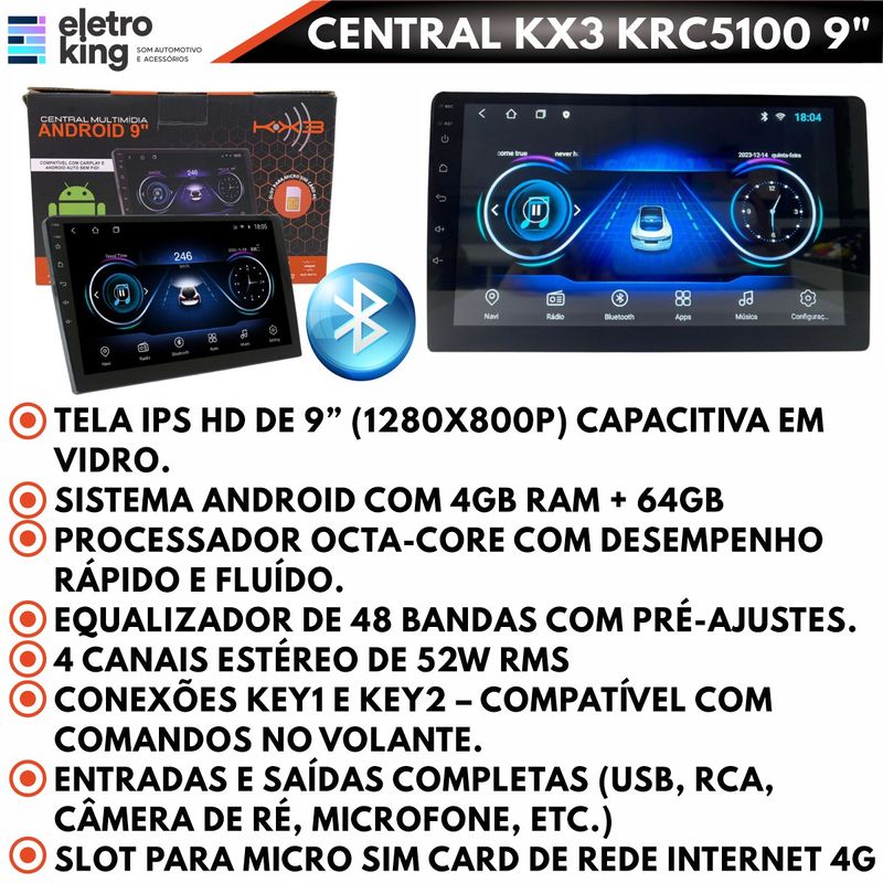 Central Multimídia KX3 KRC5100 Android 9" Octacore Carplay BT/GPS/Espelhamento/USB/FM - 4GB Ram Central Multimídia KX3 KRC5100 com tela de 9 polegadas em vidro IPS HD, sistema Android e processador Octa-Core, garantindo rapidez e desempenho superior. Equipada com 4GB de RAM e 64GB de memória interna, oferece fluidez no uso de aplicativos e ampla capacidade de armazenamento. Conta com CarPlay, Android Auto e espelhamento para maior integração com o smartphone, além de Bluetooth para chamadas e músicas, GPS integrado para rotas precisas, entrada USB e rádio FM. Uma multimídia completa que une tecnologia, conectividade e praticidade para transformar a experiência a bordo. Especificações Técnicas: • Marca: KX3 • Modelo: KRC5100 • Sistema Operacional: Android • 4GB de RAM • 64GB de Memória interna para Download de Aplicativos. • Tela de 9 Pol em vidro IPS HD 1280X800p capacitiva. • Saída de Áudio • Slot para MICRO SIM Card para rede de internet 4G. • Equalizador 48 bandas e Pré-equalizadas. • Conector Principal (Acompanha Chicote). • Conexão KEY1 e KEY2 para Controle de Volante. • 2 USB traseiro com Extensão e Função Carregador. • FM com 18 Memórias • 4 Canais Estéreo de 52W • Entrada para Câmera de Ré • Entrada de Áudio e Vídeo RCA • Controle de Antena Elétrica • Entrada para Microfone Embutido • Microfone Embutido • Teclas Touch com 7 Cores • Processador Octa-Core • Sistema de Vídeo: Sistema de Vídeo: AVI – MP4 – DIVX – MPEG – DAT –FI.V RMVB – VCB – MOV – JPEG • Sistema de Áudio: MP1 – MP2 – MP3 – MP4 – MP5 DolbyDigital – WMA – PCM – LPCM – MPEG Conteúdo da Embalagem: • 1 Central Multimídia KX3 KRC5100 Android 9 Pol • 1 Chicote principal para Alimentação e para Alto-Falantes • 4 Parafusos • 1 Antena GPS • 2 Extensões USB • 1 Chicote Acessórios RCA + slot SIM card • 2 Suportes para Fixação • 1 Chicote entrada Câmera de Ré e Antena Wi-Fi • 1 Antena 4G • Manual de Instalação Importante: • Garantia de 90 Dias. • Valor Unitário.
