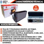 Central Multimídia MP5 FP Import Viper-X 1 Din 7" BT/2 USB/AUX/FM/Carplay/Espelhamento - 4 x 50W A Central Multimídia Viper-X 1 Din de 7” transforma seu carro em um verdadeiro centro de entretenimento. Com Bluetooth, duas entradas USB, AUX, FM, Carplay e espelhamento de celular, você tem total conectividade e praticidade. Seu som potente de 4 x 50W garante qualidade e intensidade, enquanto a tela de 7” oferece visualização clara e controles intuitivos, tornando cada viagem mais segura e divertida. Especificações Técnicas: • Marca: FP Import • Modelo: Viper-X MP5 1 Din • Tela: 7" Retrátil • Potência de saída: 4 x 50W RMS • Conectividade: Bluetooth, Carplay, Espelhamento de celular. • Entradas frontais: 2 USB, AUX • Rádio FM integrado • Conexões traseiras: entradas para câmera de ré, saídas RCA de áudio e vídeo, conexões auxiliares. • Formatos de mídia compatíveis: áudio, vídeo e imagem. • Funções de controle: tela sensível ao toque e controles no painel • Dimensões Aproximadas: 15 x 22 x 12 cm Conteúdo da Embalagem: • 01 Central Multimídia MP5 Viper-X 1 Din 7 Pol • 01 Controle remoto • 01 Chicote de instalação • 01 Cabo de conexão traseira • 01 Manual do usuário Importante: • Garantia de 90 Dias. • Valor Unitário.