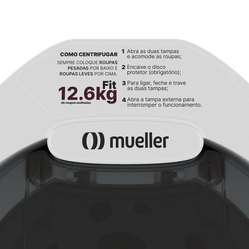 Centrífuga de Roupas Mueller Fit 12,6Kg de Roupa Molhada Branca 220VCom capacidade para 12,6Kg* de roupa molhada, a Centrífuga Fit torna seu dia a dia muito mais prático. *Equivalente a 4,2Kg de roupas secas, conforme Inmetro.Sua performanceCom 1720 rotações por minuto, garante roupas quase secas em menos tempo.Possui um encaixe especial para recipientes para que a água da centrifugação possa ser armazenada e utilizada para a limpeza de áreas externas.Informações Técnicas:- Tipo de Montagem: Centrifuga de Chão Com Pés Emborrachados;- Timer: Não;- Tampa: Dupla Tampa Com Abertura Superior;- Modelo: Centrífuga Fit Branca;- Tipo de Alimentação: Elétrico;- Programas de Secagem: Rotação de 1720rpm;- Velocidade de Rotação: 1720Rpm;- Tipo de Secagem: Por Rotação;- de Funções: 1;- Cor: Branca;- Tipo de Tela: Não se Aplica;- Tipo: Centrífuga de Roupas;- Cesto Interno: Plástico;- Altura (cm): 69cm;- Comnto: 43,5Cm;- Largura (cm): 41,1cm;- Profundidade (cm): 43,5cm;- Peso (Kg): 7,2Kg;- Capacidade de roupa seca (Kg): 4,2Kg;- Capacidade roupa molhada (Kg): 12,6Kg;- Capacidade Interna do Cesto (litros): 16 Litros;- : Pegadores laterais;- Marca: Mueller;- Garantia: 12 Meses.