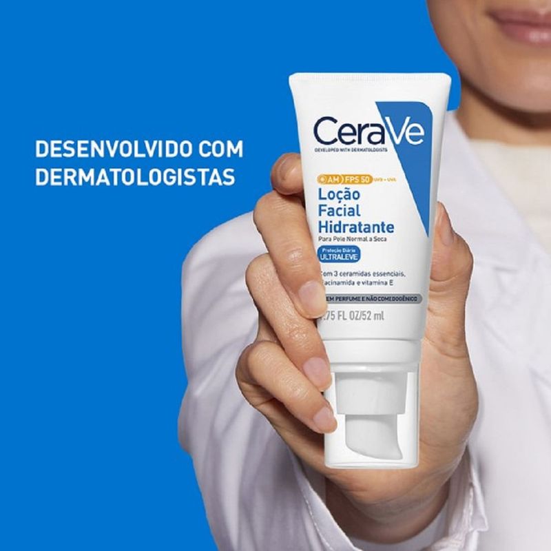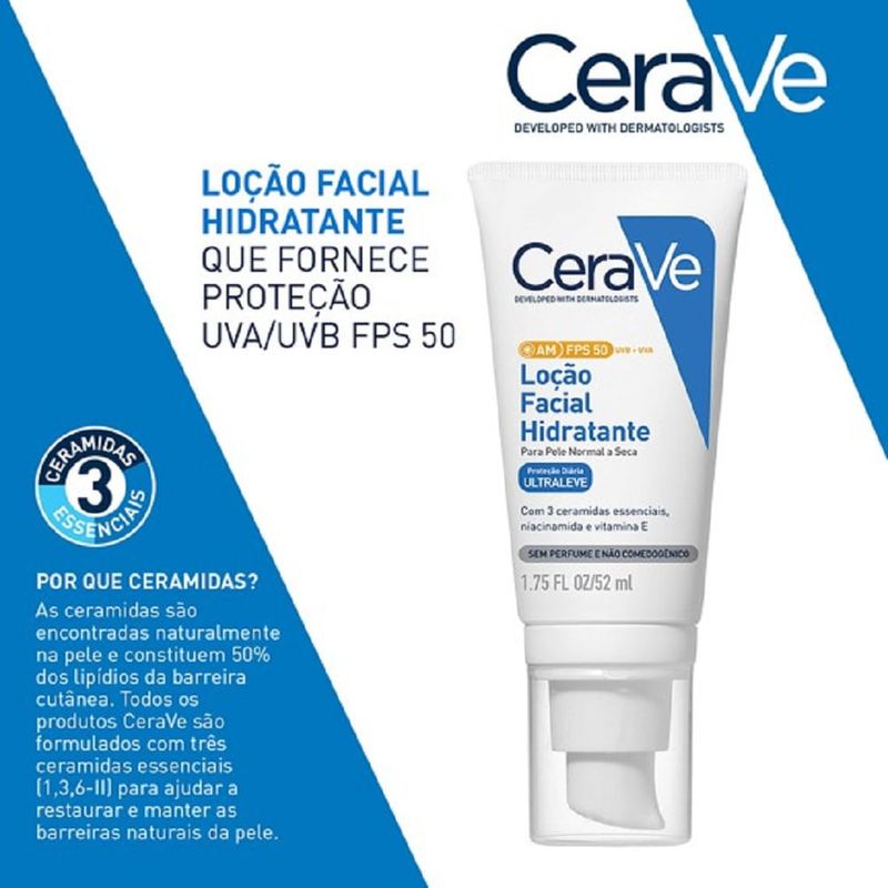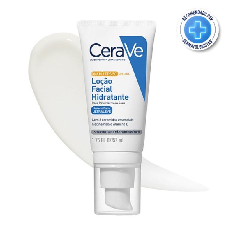 CeraVe Loção Facial Hidratante FPS 50 52ml O que é? A CeraVe Loção Facial Hidratante FPS 50 é um protetor solar facial desenvolvido para oferecer proteção de amplo espectro contra os raios UVA e UVB, ao mesmo tempo que hidrata e repara a pele. Ideal para uso diário, esta loção é enriquecida com ceramidas e ácido hialurônico. Para que serve? Este produto é essencial para proteger a pele dos danos solares enquanto promove a hidratação e o fortalecimento da barreira cutânea. É ideal para quem busca uma proteção solar eficiente sem abrir mão do cuidado com a hidratação da pele. Como funciona? A Loção Facial Hidratante FPS 50 combina proteção solar de alta potência com uma fórmula hidratante que ajuda a manter a umidade da pele. As ceramidas ajudam a restaurar e manter a barreira natural da pele, enquanto o ácido hialurônico proporciona uma hidratação intensa. Como usar Aplique generosamente sobre a pele limpa e seca do rosto, 15 minutos antes da exposição ao sol. Reaplique a cada 2 horas ou após nadar, suar ou se secar com uma toalha. Composição Filtros solares de amplo espectro (FPS 50) Ceramidas Ácido Hialurônico Advertências Uso externo. Evite contato com os olhos; em caso de contato, lave-os imediatamente com água. Suspenda o uso se ocorrer irritação e consulte um médico. Mantenha fora do alcance de crianças. A aplicação insuficiente reduz a proteção. Principais Benefícios Proteção solar alta FPS 50 Hidratação intensa Reforça a barreira cutânea Fórmula não oleosa e de rápida absorção Dica Para melhor eficácia, use a loção diariamente, mesmo em dias nublados, e não se esqueça de reaplicar conforme necessário durante a exposição ao sol.