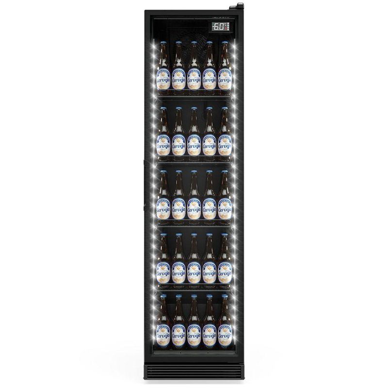 Cervejeira Vertical Porta De Vidro 310 Litros Gcb30vlb Gelopar Expositor All Black 220vCervejeira Vertical 310 Litros GCB30VLB Gelopar. Ideal para lanchonetes, bares, restaurantes e similares. Conservação e exposição de Cervejas e Bebidas (Água, Sucos e Refrigerantes). Temperatura regulável: -6°a +3°C (Modo Economia). Controlador eletrônico com indicador de temperatura. Refrigeração: Ar forçado com evaporador aletado. Condensador estático, com ventilação natural. Degelo: Automático. Iluminação: 2 barras de LED internas (perimetral). Porta de vidro duplo temperado baixo emissivo, com sistema de aquecimento, serigrafia e perfil slim. Prateleiras aramadas: 4 níveis reguláveis. Revestimento: Interno e externo em aço pré-pintado preto. PORTAS: 1. CONSUMO: 6,39kWh/dia. FREQUÊNCIA: 60Hz. PLANO DE CARGA: 113 garrafas 600ml ou 293 long necks 350ml. CAPACIDADE: 310 litros. PESO: 73kg. DIMENSÕES(CxAxP): 50,5x190,7x63cm. Equipamento certificado conforme Portaria Inmetro nº 148/2022. Cervejeira Vertical 310 Litros GCB30VLB Gelopar é na Atau.Marca - GeloparModelo - GCB30VLBCapacidade - 310 LitrosFrente - 50,5cmAltura - 190,7cmProfundidade - 63cmTemperatura - -6°a +3°C (Modo Economia)Peso - 73kgConsumo - 6,39kWh/diaPortas - 1 PortaPrateleiras - 4