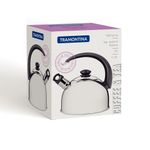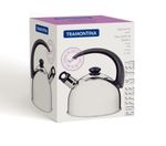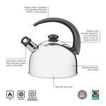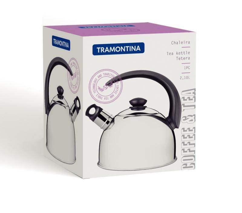 Chaleira Aço Inox 2 Litros Com Apito Tramontina Não basta ser bonita, uma chaleira precisa oferecer segurança também. Essa características está presente na Chaleira com Apito em Aço Inox Cabo Preto 2,1 L. Ela possui um apito que avisa quando a água estiver fervendo. Esse sistema é acionado por meio do vapor no momento em que a água inicia a fervura na chaleira. Além disso, ela é produzida em aço inox e possui um cabo em material especial, que não deixa o calor passar e uma tampa que evita desperdícios. Elegante e segura, a Chaleira com Apito precisa fazer parte da sua cozinha! Descrição do produto Marca: Tramontina Material: Aço Inox Capacidade: 2,1 L Revestimento Interno: Sem revestimento Tipo de Fogão Gás, Elétrico, Vitrocerâmico (resistência elétrica) Máquina de Lavar Louça: Sim Dimensões (AxLxP): 21,8 x 19 x 22,8cm Imagens meramente ilustrativas, todos os itens que ambientam o produto não estão inclusos.
