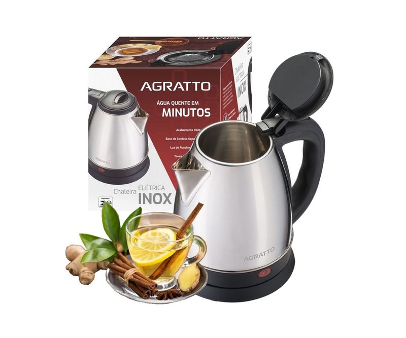 CHALEIRA ELETRICA EM AÇO INOX 110/127v 1,8 LITROS AGRATTOA Chaleira Elétrica Inox Agratto é a solução perfeita para quem precisa ganhar tempo na cozinha, pois garante agilidade no preparo de bebidas e refeições. Tudo isso com muito mais design no seu dia a dia!Design e eficiência: água quente ou fervida em poucos minutos!Aqueça rapidamente 500ml a 1,8 Litros de água para o que você precisar! Café, chá, chimarrão ou para adiantar o preparo de alimentos. Acabamento em aço inox que vai dar um toque de requinte para a sua cozinha.Tudo em apenas um toque: Simples e prática: basta encher a chaleira, colocá-la sobre a base e acionar o botão On/Off. Diferencias:- Ideal para sua residência:Para aquecer a água do preparo de cafés, chás, mates e muito mais. Jarra de 1,8L: Jarra de aço inoxidável com capacidade para 1,8L.- Tampa com trava de segurança: Ajuda a evitar acidentes na cozinha.- Luz indicadora de funcionamento: Avisa quando a chaleira está em funcionamento e desliga automaticamente ao ferver a água.- Base de contato separada: Base de contato elétrico pode ser retirada para facilitar o uso e a limpezaDados Técnicos:Marca: AgrattoModelo: CE-01 – 110/127VCor: InoxTensão: 110/127V Potência: 1000W – 110/127VConsumo de energia: 1,0kw/h – 110/127VAmperagem: 7,9A – 110/127v Tamanho: 20cm de largura X 18cm de profundidade X 21cm de alturaCapacidade: 1,8 litroPeso: 0,78 kgGarantia: 1 ano contra defeito de fabricação.