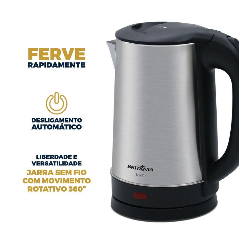 Bebida quente e muito mais elegância para sua cozinha com a Chaleira Elétrica Britânia BCHE01 360° 1,6L 1500W! Versátil, a jarra da chaleira tem o movimento rotativo 360°e uma generosa capacidade de 1,6 litros, além de uma base destacável com porta-fio e acabamento em aço inox. Além disso, a Chaleira Elétrica Britânia BCHE01 possui pegador ergonômico e um botão de abertura da tampa que facilita trazendo mais segurança aos seus dias na hora do manuseio. Um cafezinho ou um chá relaxante? Não importa, quando bate à vontade, não precisa perder tempo, a Chaleira Elétrica Britânia BCHE01 ferve a água rapidinho e ainda dá um toque super contemporâneo para a sua cozinha. • Capacidade de 1,6 litros • Desligamento automático após iniciar a fervura • Jarra em aço inox • Pode-se girar a jarra 360° sobre a base • Jarra removível, liberdade durante o uso • Botão para abertura da tampa • Base com local para armazenamento do cordão elétrico • Dispositivo de segurança contra superaquecimento • Luz indicadora de funcionamento.