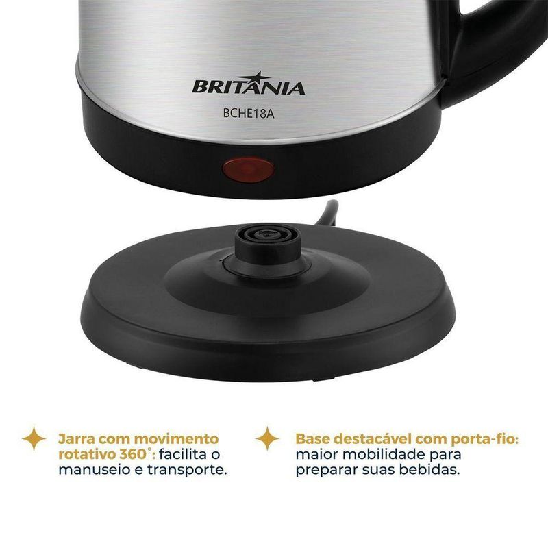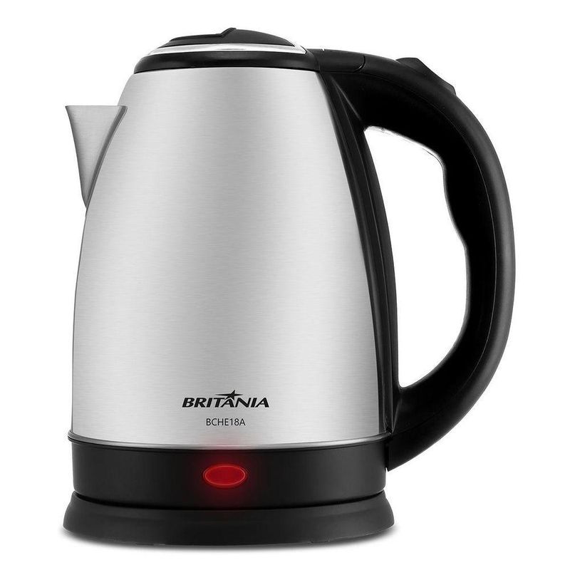 Chaleira Elétrica Britânia 1,8L Inox BCHE18A 220VTenha água quente em segundos para seu chá, café ou preparos culinários, sem precisar de fogão. Combinando design sofisticado e tecnologia inteligente, a Chaleira Elétrica Britânia BCHE18A simplifica sua rotina em casa, no escritório ou em ambientes comerciais. Com capacidade de 1,8 litros, atende suas necessidades garantindo praticidade para todos os momentos.O corpo em aço escovado dessa Chaleira Elétrica assegura durabilidade e resistência, enquanto o desligamento automático evita superaquecimento, oferecendo segurança total. A base rotativa 360° e a jarra sem fio permitem encher e servir com facilidade, e a tampa com abertura por botão traz praticidade até para as mãos mais ocupadas.Sinta o aroma do café fresco pela manhã ou o chá perfeito para relaxar à noite! A Chaleira 1,8L Britânia transforma momentos simples em experiências especiais. A elegância do aço inox e o silêncio discreto da operação complementam qualquer ambiente, enquanto a facilidade de limpar mantém sua rotina leve.Com a Chaleira Elétrica Britânia BCHE18A, sua rotina ganha velocidade e sofisticação. Rápida, segura e adaptável a qualquer estilo de vida, ela é o toque final que faltava na sua cozinha. Garanta a sua agora e desfrute de praticidade que aquece o dia inteiro!Principais Características- Material da jarra e alça: Aço inox e plástico PP- Desligamento automático- Capacidade da jarra em litros: 1,8L- Potência: 1150W e 1500W- Jarra sem fio- Segurança contra superaquecimento- Botão para abertura da tampa- Suporte para armazenar o cordão- Jarra com giro 360° sobre a base- Painel com indicador luminoso.Especificações TécnicasMarca: BritâniaModelo: BCHE18ACor: PretoCapacidade: 1,8 LEstado: NovoPotência: 1150WControle de temperatura: NãoMaterial da jarra: InoxDesligamento automático: SimBase destacável: SimAltura do produto: 24 cmLargura do produto: 23 cmComprimento do produto: 17,5 cmPeso do produto: 0,744 kgAltura com embalagem: 24 cmLargura com embalagem: 19 cmComprimento com embalagem: 19 cmPeso com embalagem: 0,886 kgGarantia: 360 Dias