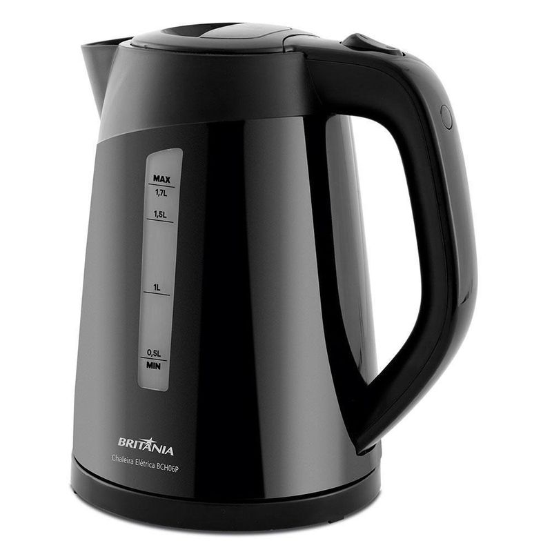 Chaleira Elétrica Britânia BCH06P Com 1,7 Litros E Desligamento Automático Preto BivoltGosta de sempre tomar um chá ou café passados na hora? A Chaleira Elétrica Britânia vai facilitar essa tarefa. Ela ferve a água rapidamente para preparar seu chá, café, cappuccino, chimarrão ou até mesmo para acelerar o preparo daqueles alimentos que precisam de um cozimento. Sua jarra possui capacidade de 1,7 litros, movimento 360°, base destacável e porta-fio, tudo isso para facilitar o seu dia a dia, tanto no manuseio e quanto no transporte da chaleira. Por falar em transporte, ela pode ser levada à mesa. Com o desligamento automático, você não precisa se preocupar em fazer outras tarefas enquanto deixa a água esquentando. Para sua segurança e da sua família, ela conta com luz indicadora de funcionamento e pegador ergonômico com toque frio. O botão para abertura da tampa e bico vão te ajudar no momento do manuseio.VOLTAGEM: BI
