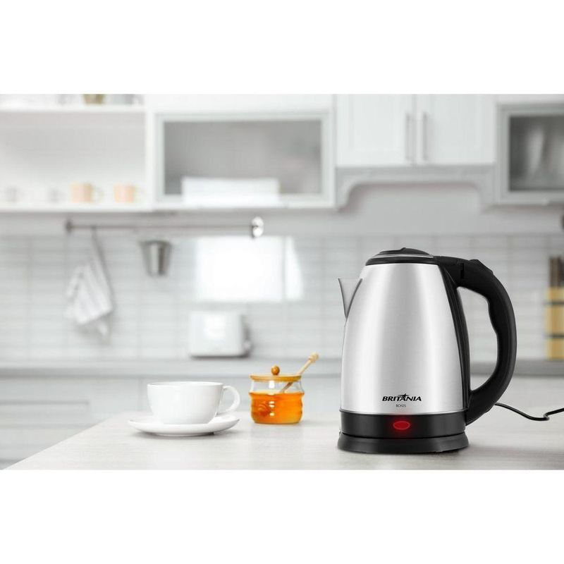 Chaleira Elétrica Britânia BCH25 2L Inox 220VTenha água quente de forma prática e muito rápida com a Chaleira Elétrica Britânia BCH25 2L Inox. Não se preocupe em esquecer a jarra ligada! Quando conectada à Base 360°C, a Jarra Elétrica funciona em qualquer ângulo e aquece sua água até atingir fervura. Após isso, ela desliga automaticamente e torna seu uso mais prático, seguro e funcional no seu dia a dia.Além disso, é possível servir direto na mesa. Sim! A chaleira trás versatilidade para a cozinha e outros cômodos da casa pois seu corpo é livre de fios, a base é destacável, facilitando o manuseio, armazenamento e transporte.A jarra em inox com capacidade para 2 litros, proporciona uma limpeza fácil, além de facilitar o alcance rápido de altas temperaturas da água, e garantir maior resistência a corrosão e atrito. O sistema de abertura da jarra, possui botão automático que facilita abertura e evita acidentes. Conte com os Eletroportáteis Britania para trazer mais praticidade à sua rotina doméstica. Conte com a Chaleira Elétrica Britânia BCH25 2L Inox!Principai Características- Capacidade de 2 litros- Desligamento automático após iniciar a fervura- Jarra em aço inox- Pode-se girar a jarra 360° sobre a base- Jarra removível, liberdade durante o uso- Botão para abertura da tampa- Base com local para armazenamento do cordão elétrico- Dispositivo de segurança contra superaquecimento- Luz indicadora de funcionamento.Observação:Somente faturamos para o nosso consumidor final, ou seja, não faturamos pedidos para CNPJ por este portal de vendas;Especificações TécnicasMarca:BritâniaModelo:BCH25Cor:PrataCapacidade:2,0 LEstado:NovoPotência:1200 WControle de temperatura:NãoMaterial da jarra:InoxDesligamento automático:SimBase destacável:SimAltura do produto:24 cmLargura do produto:23 cmComprimento do produto:17,5 cmPeso do produto:1,45 kgAltura com embalagem:23 cmLargura com embalagem:20,2 cmComprimento com embalagem:17 cmPeso com embalagem:0,844 kgGarantia:360 Dias