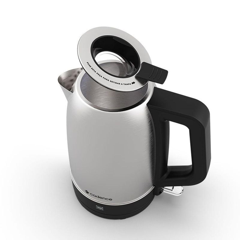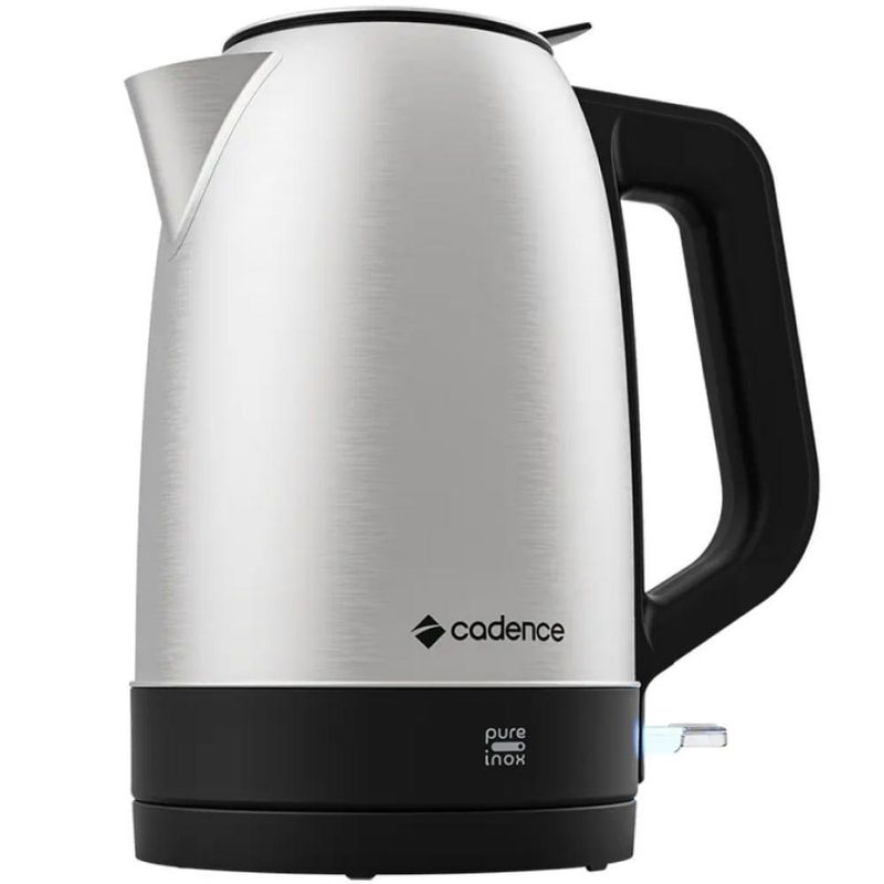 Chaleira Elétrica Cadence Pure 1,7L Inox 110VChaleira Elétrica Pure Inox CadenceQuando bate a vontade de um chá relaxante ou um café energizante, não precisa perder tempo. A Chaleira Elétrica Pure Inox Cadence é a solução rápida, moderna e prática para o seu dia a dia. Ideal para preparar bebidas quentes, sopas e agilizar receitas, ela é sua parceira de todas as horas.CaracterísticasFerve rapidinho: Até 1850W de potência, com água fervida em poucos minutos. Tempo aproximado de fervura:127V: de 7min40s (min) a 2min40s (max)220V: de 5min20s (min) a 2min30s (max)Capacidade de 1,7L: Permite ferver de 500ml a 1,7L de água.Acabamento em inox: Alta durabilidade, fácil de limpar e sempre bonita.Tampa Easy Fill (Enche Fácil): Abre facilmente com a queda d'água e fecha sozinha logo após. Possui alça para retirada com praticidade.Desligamento automático: Mais segurança e tranquilidade.Proteção Anti-dry: Evita superaquecimento e garante segurança no uso.Base antiderrapante: Estabilidade e firmeza durante o uso.Indicador luminoso: Modernidade e praticidade visual.Porta fio: Organização e bancada sempre arrumada.Leve e prática: Pesa menos de 1kg, fácil de manusear.1 ano de garantia: Compromisso Cadence com a sua satisfação.Dica de uso: Antes de utilizar sua chaleira pela primeira vez, ferva uma boa quantidade de água e descarte. Repita esse processo duas vezes para eliminar possíveis resíduos. Nunca prepare chás, cafés ou outras bebidas diretamente na jarra.Especificações TécnicasModelo: CEL810-127 | CEL810-220Tensão: 110VCódigo Produto: CEL810Potência: 1200W (110V)| 1850W (220V)Consumo: 1,2 kW/h (110V) | 1,85 kW/h (220V)Dimensões [LxAxP]: 145x250x222mmPeso: 0,72 KgSelo de Segurança: OCP SGSGarantia: 12 meses