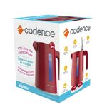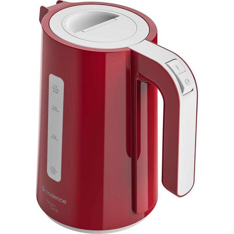 Chaleira Elétrica Cadence Thermo One Colors 1,7L Vermelha 220VChaleira Elétrica ColorsSem perder tempo, sem ocupar espaço!Esquenta água de maneira rápida e práticaCapacidade de 1,7L com indicador de LED — para fazer muito de uma vez sóResistência embutida: mais segurança e higieneSistema luminoso que indica o processo de fervuraBase antiderrapanteJarra independente da base: pode ser levada à mesaPotente e com baixo consumo de energiaProduto com 1 ano de garantiaUso e BenefíciosA Chaleira Elétrica Colors foi feita para auxiliar no dia a dia de quem não quer perder tempo no preparo de bebidas e alimentos. Ela ferve a água em poucos minutos, acelerando o preparo de chá, café e outras receitas.Seu design exclusivo prioriza a praticidade: Portátil, pode ser retirada da base após a fervura e levada diretamente para a mesa.Além disso, evita desperdício de energia e gás:Consome menos do que um micro-ondas e dispensa o uso do fogão para aquecer água.Design e cores exclusivas CadenceAbertura fácilSistema de proteção contra superaquecimentoEspecificações TécnicasModelo: CEL381-127 | CEL381-220Tensão: 220VCódigo Produto: CEL381Potência: 1200W (110V) | 1850W (220V)Consumo: 1,20kWh (110V) / 1,85kWh (220V)Dimensões [LxAxP]: 210x233x145mmPeso: 0,72kgClassificação Fiscal / NCM: 8516.10.00CEST: 21.043.00Certificações: InmetroCódigo da Certificação: SGSGarantia: 12 Meses