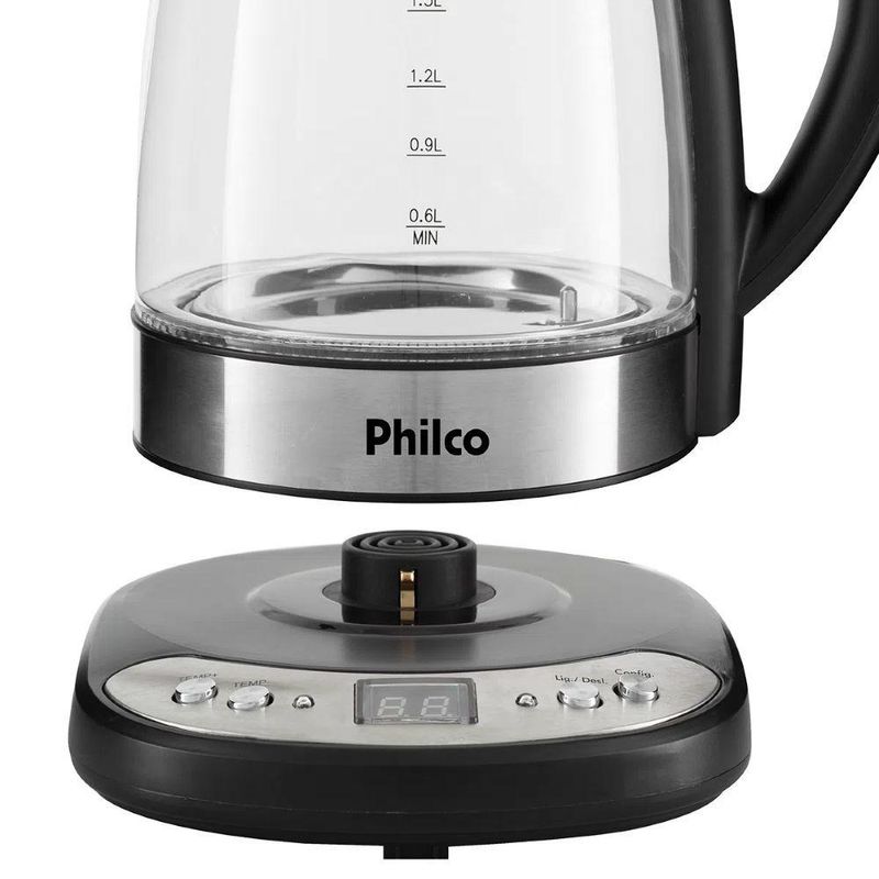 Chaleira Elétrica Digital Glass 1,7L PCHD Philco 110VCódigo do Fornecedor: 53951015Marca: PhilcoConteúdo da embalagem: 1 Chaleira Elétrica Digital Glass 1,7L PCHD Philco Painel Digital Com Controle de Temperatura 110VA Chaleira Digital PhilcoGlass PCHD1,7L é a escolha ideal para quem busca praticidade e eficiência no preparo de bebidas quentes.Com capacidade para até 1,7 litros de Água fervida, esta chaleira elétrica proporciona rapidez no aquecimento, tornando o processo de preparo de chás, chimarrão, café instantâneo e outras bebidas quentes muito mais ágil.Um dos principais destaques desta chaleira é o controle de temperatura eletrônico, que permite ajustar a temperatura da Água de 50 a 95°C, com possibilidade de ajuste de 5 em 5°C. Isso garante que você possa preparar suas bebidas preferidas na temperatura ideal.Além disso, a chaleira possui uma jarra de vidro destacável da base, o que a torna portátil e facilita tanto na hora de servir como de transportar. O desligamento automático ao atingir o ponto de ebulição da Água, acompanhado de um bip sonoro, proporciona segurança e tranquilidade durante o uso.A base antiderrapante garante estabilidade e segurança durante o manuseio, enquanto o botão para abertura da tampa facilita o acesso e evita acidentes.Outros recursos incluem um display para indicação da temperatura de 50 a 95°C e um indicador de nível de Água na jarra, garantindo maior praticidade e controle durante o preparo das suas bebidas favoritas.Com a Chaleira Digital PhilcoGlass PCHD1,7L, você terá uma maneira fácil, segura e eficiente de preparar suas bebidas quentes preferidas, sempre na temperatura ideal.Garantia: 12 mesesVoltagem: 110V
