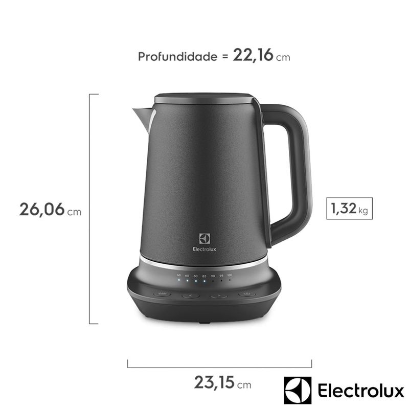 Capacidade de 1,7 litros, desligamento automático e trava na tampaDestaquesTecnologia PerfectSenseIdeal para atingir a temperatura exata dos mais diversos preparos. Varia o controle de temperatura entre 40°C a 100°C.Função Manter AquecidoConserva a temperatura por até 40 minutos. Após acionada, é ativada ao longo deste período sempre que o calor da água diminui 2°C.Ótima Capacidade1,7L para você aquecer a quantidade ideal de água para diversas receitas.Design PremiumProjetada em aço inox, o acabamento é texturizado e oferece alto padrão de elegância.Indicador Transparente do Nível da ÁguaVisualize facilmente a quantia colocada para preparo.Tampa Pop-UpSegura para o dia a dia, a chaleira só abre caso este sistema seja acionado.Base 360°Posicione a jarra na base de aquecimento em qualquer ângulo, com facilidade.Sistemas de Segurança IntegradosA chaleira desliga automaticamente caso não haja água suficiente no reservatório.Desligamento AutomáticoO produto emite aviso sonoro e desliga automaticamente ao atingir a temperatura de aquecimento desejada.Facilidade de TransporteCorpo da chaleira livre de fios.Alça ErgonômicaOferece máximo conforto no manuseio.Enrolador de CaboA base de aquecimento possui enrolador de fios para manter sua cozinha organizada quando o produto não está em uso.CaracterísticasCapacidade: 1,7 LitrosDesligamento AutomáticoTrava na TampaEspecificações TécnicasModelo: EKP70Cor: Black PearlMaterial: Aço InoxidávelPotência: 1250W (110V) / 2000W (220V)Consumo: 1,25kW/h (110V) / 2,0kW/h (110V)EAN: 7896347164603 (110V) / 7896347164627 (220V)Garantia: 12 mesesDimensões e PesoDimensões do Produto sem Embalagem (AxLxP): 261x222x232 mmDimensões do Produto com Embalagem (AxLxP): 250x262x222 mmPeso do Produto sem Embalagem: 1,32 KgPeso do Produto com Embalagem: 1,58 KgItens Inclusos01 ChaleiraManual