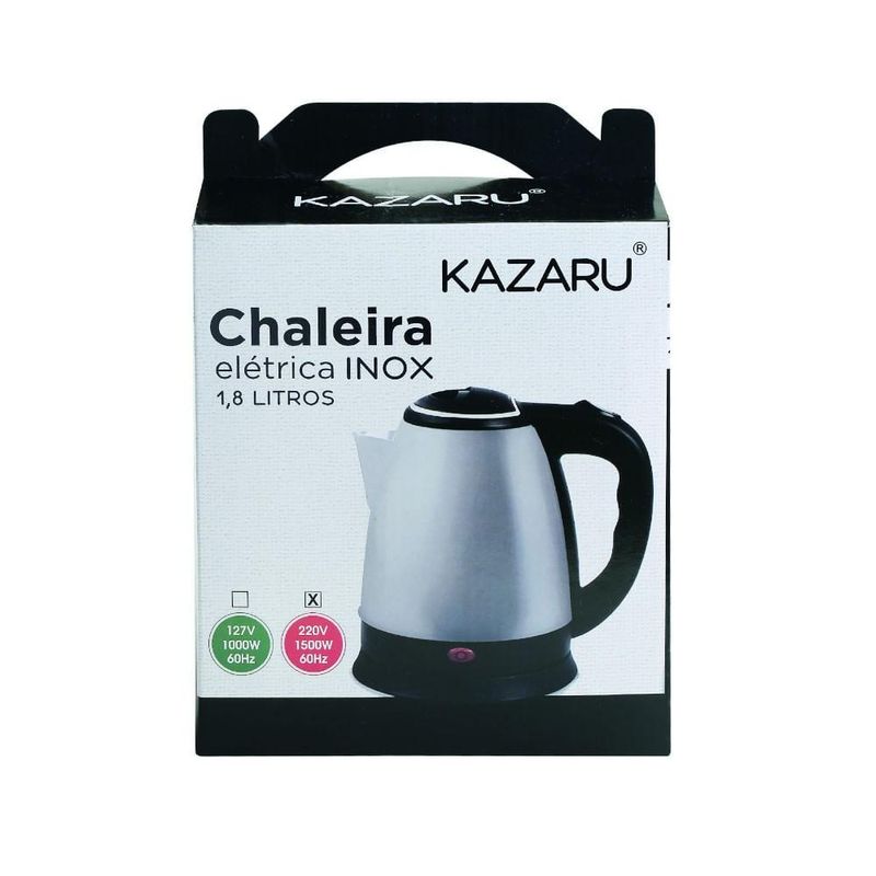 Chaleira Elétrica Kazaru 1,8LPraticidade e eficiência para o seu dia a dia! Com capacidade de 1,8 litros, esta chaleira elétrica é ideal para preparar água quente de forma rápida e segura, seja para chás, cafés ou outras bebidas.Principais característicasCapacidade: 1,8L – perfeita para uso individual ou familiarDesign moderno: acabamento elegante que combina com qualquer cozinhaAquecimento rápido: potência que garante água quente em poucos minutosSegurança: sistema de desligamento automático ao atingir a fervuraPraticidade: base giratória 360° e jarra sem fio para maior mobilidadeIndicador luminoso: mostra quando o aparelho está em funcionamentoInformações adicionaisProduto em conformidade com regulamentação do InmetroTodas as informações técnicas são de responsabilidade exclusiva do fabricante/fornecedorA cor do produto pode variar de acordo com as configurações do seu monitor
