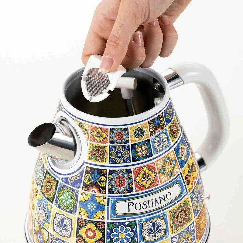 Chaleira Elétrica Positano 1,7L Ariete 110VA Chaleira elétrica Positano da Ariete é uma verdadeira aliada para os amantes do chá, chás de ervas e bebidas quentes. Desfrute de sua bebida com a elegância da chaleira que faz a água ferver rapidamente, em poucos instantes você terá sua bebida quente pronta. Filtro removível e lavável: Graças ao filtro no bico da chaleira, você sempre pode obter água filtrada e pronta para beber, de modo a garantir uma longa vida útil à sua chaleira. Capacidade de 1,7 litros Em apenas alguns minutos. Escolha sua essência e dê um toque de classe e elegância à sua cozinha.Especificações do produto:- Design moderno: Estampa colorida e acabamentos cromados- Base com giro de 360º- Com indicador visível do nível de água- Filtro removível para chás de ervas- Desligamento automático- Segurança de paredes frias e base de apoioFicha técnica:- Código: 4083190065- Marca: Ariete- Conteúdo da Embalagem: 1 Chaleira Elétrica- Material: Aço inox - Voltagem: 127V- Potência: 1500W- Capacidade Líquida: 1,7 litros- Peso: 2,10kg- Dimensões: 29cm x 17,5cm x 24,5cm (AxLxP)- Garantia: 12 Meses - Contra defeito de fabricação- Certificação Inmetro: BRA23/00640Altura - 29cmLargura - 17,5cmProfundidade - 24,5cmPeso - 2,10kgSobre a Marca - A marca italiana Ariete, fundada em 1964, tem sede na Toscana e é conhecida pela criatividade e inovação. O seu sucesso reside em produtos diferenciados e concebidos de forma criativa, apoiados por investimentos significativos em pesquisa e desenvolvimento. A marca Ariete agora se expande para o Brasil com produtos pensados para o mercado brasileiro, mantendo a qualidade europeia.