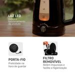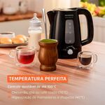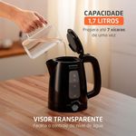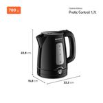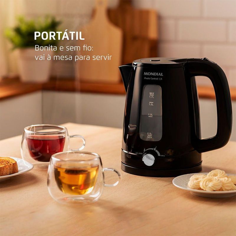 Chaleira Elétrica Pratic Control 17L Mondial CE-17-BC 110VA Chaleira Elétrica Mondial Pratic Control é ideal para quem ama uma bebida quentinha - e ainda facilita a rotina de quem tem bebê em casa. Com controle de temperatura ajustável até 100 °C, ela atinge o ponto perfeito para fazer chimarrão, chá ou café coado (70 °C) e ainda higieniza mamadeiras e chupetas (40 °C). Tudo de modo intuitivo.Com capacidade de 1,7 L, é possível fazer até 7 xícaras de chá de uma única vez. E seu visor transparente facilita o controle do nível de água. O sistema de aquecimento rápido reduz o consumo de energia ao ferver a água em poucos minutos. O filtro removível retém impurezas e facilita a higienização.Com design moderno e jarra destacável, ela pode ser levada à mesa para servir.Muito prática, chaleira elétrica CE-17-BC atende quem valoriza agilidade. Conheça todas as funcionalidades da Pratic Control Mondial que vão facilitar seu dia a dia:Temperatura Perfeita: O controle ajustável de até 100 °C permite que você escolha a temperatura certa para o chimarrão (70 °C) e a higienização de mamadeiras (40 °C). Basta girar o botão para selecionar o ajuste térmico desejado.Rápida e Potente: Ferve ou aquece água em poucos minutos para fazer café, chá, chimarrão e outras bebidas. A água quente ainda facilita o dia a dia na cozinha, acelerando o preparo de diversas receitas.Capacidade de 1,7 Litros: Com alto desempenho, a CE-17-BC prepara até 7 xícaras de chá de uma só vez.Visor Transparente: Facilita o controle do nível de água. Pode ser usada com pouca ou muita quantidade, de acordo com sua necessidade.Filtro Removível: Fácil de usar e limpar, ajuda a reter impurezas da água.Luz LED: Indica visualmente quando o aparelho está em funcionamento.Alça Isotérmica: Ergonômica, não aquece e permite o manuseio com mais conforto.Jarra Removível: Pode ser transportada com tranquilidade e é ideal para servir à mesa.Tampa Abre-Fácil: Basta acionar o botão e realizar o abastecimento de água.Botão ON/OFF: Permite ligar e desligar a chaleira com facilidade, trazendo segurança e economia de energia.Desligamento Automático: Impede que a água ferva até secar. Além de oferecer mais segurança, ajuda a economizar energia.Porta-fio: Facilita na hora de guardar o aparelho.Um Ano de Garantia Mondial: A Mondial é a escolha de milhões de consumidores.Mondial, a escolha inteligente!Marca: MondialModelo: CE-17-BCCor: PretoVoltagem (Tensão): 127V/220VItens inclusos: 01 Chaleira Elétrica; 01 Filtro Removível e 01 Manual de InstruçõesDesligamento automático: SimCapacidade em litros: 1,7LMaterial: PlásticoTipo de tomada: 10AAlimentação: Energia ElétricaPotência: 1200W (127V) / 1850W (220V)Guarda-fio: SimComprimento do cabo: 0,85mPeso: 0,82kgDimensões do produto: 23cm x 16,6cm x 22,8cm (AxLxP)Garantia: 12 Meses