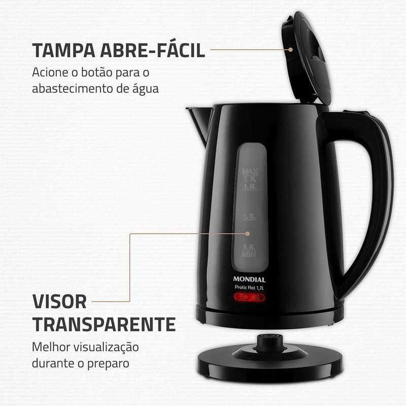 Chaleira Elétrica Pratic Hot 1,7l Mondial- Ce-17 Chaleira Eletrica Ce-17 127v/60hzA Chaleira Elétrica Pratic Hot Mondial é perfeita para facilitar o seu dia a dia na cozinha! Com 1,7 litros de capacidade, preparar bebidas quentes na temperatura ideal ou acelerar o cozimento de alimentos, vai ficar muito mais fácil! Compacta e portátil, possui fácil abastecimento de água, desligamento automático e alça isotérmica, para mais segurança em sua rotina. Saiba mais sobre a CE-17 da Mondial:CAPACIDADE: 1,7 LITROS A chaleira elétrica Mondial aquece a água em poucos minutos e prepara até 7 xícaras de chá de uma vez!VERSÁTIL:Aquece água para preparar café, chá, chimarrão e outros alimentos.FÁCIL ACIONAMENTO: Inicia a fervura com apenas um toque!VISOR TRANSPARENTE: Melhor visualização durante o preparo. Pode ser usada com pouca ou muita água, de acordo com sua necessidade.TAMPA ABRE-FÁCIL: Basta acionar o botão e realizar o abastecimento de água.PORTÁTIL: A jarra removível sem fio é ideal para servir à mesa.ALÇA ISOTÉRMICA: Ergonômica, não aquece e permite o manuseio com mais segurança e conforto.DESLIGAMENTO AUTOMÁTICO: O dispositivo de segurança desliga automaticamente após o aquecimento, impedindo que a água ferva até secar. Mais segurança e economia de energia.PORTA-FIO: Mais praticidade na hora de guardar.LÂMPADA-PILOTO: Indica o funcionamento do produto.UM ANO DE GARANTIA MONDIAL: A Mondial é a escolha de milhões de consumidores. Mondial, a escolha inteligente!Modelo - CE-17Cor - PretoVoltagem (Tensão) - 127V/220VItens inclusos - 01 Chaleira Elétrica e 01 Manual de InstruçõesDesligamento automático - SimCapacidade em litros - 1,7lMaterial - PPTipo de tomada - 10AAlimentação - Energia ElétricaPotência - 1850WGuarda-fio - NãoComprimento do cabo - 0,85mPeso - 0,70kgPeso do produto - 0,70kgGarantia - 1 AnoMarca - Mondial