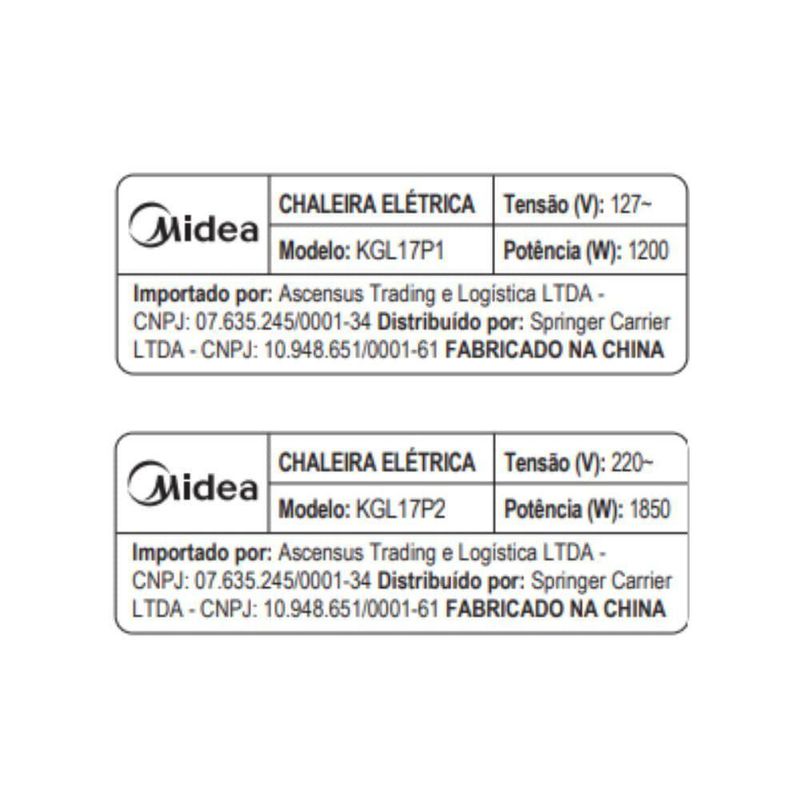 Chaleira Elétrica Preta 1,7L Double Wall Midea KDW17P2 220VA Chaleira Elétrica Double Wall Midea é perfeita para o dia a dia com sua capacidade de 1,7 litros. A potência de até 1.500W garante aquecimento rápido das bebidas. Conta com Double Wall, uma parede dupla com isolamento térmico, que mantém a parte externa fria enquanto a água ferve, garantindo maior segurança no manuseio. Seu design sem fio permite que ela seja utilizada em qualquer lugar, enquanto sua base 360º possibilita posicionar a jarra na base de aquecimento em qualquer ângulo, proporcionando muito mais praticidade no uso. E a função de desligamento automático evita o superaquecimento, prevenindo acidentes.ATENÇÃO: ESTA LOJA NÃO FATURA PARA CNPJ.Marca: MideaOrigem: ImportadoCor: PretoProduto conectado: NãoCapacidade líquida interna: 1,7LDesligamento automático: SimMaterial externo: PlásticoFunção Manter Aquecido: NãoBase giratória: 360Portátil: SimCorrente Nominal 127v (A): 9,4Corrente Nominal 220v (A): 6,8Potência Nominal 127v (W): 1200Potência Nominal 220v (W): 1500Produto Comprimento (cm): 22 cmProduto Largura (cm): 15,5 cmProduto Altura (cm): 24,5 cmProduto Profundidade (cm): 22 cmProduto Peso (kg): 0,7 kgProduto Embalado Altura (cm): 28,2 cmProduto Embalado Comprimento (cm): 19,4 cmProduto Embalado Largura (cm): 22,6 cmProduto Embalado Profundidade (cm): 19,4 cmProduto Embalado Peso (kg): 1,2 kgItens inclusos na embalagem: Chaleira Elétrica Double Wall Midea e Manual de usuárioGarantia do Produto: 12 meses (1 ano)