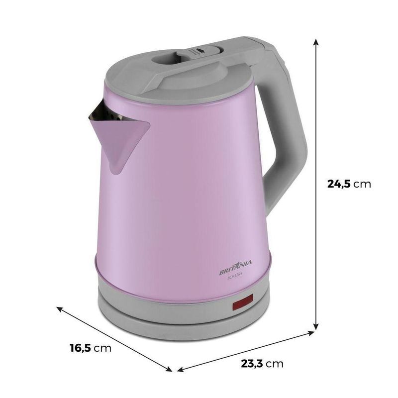 Chaleira Elétrica Rosa Britânia 1,9L Inox BCH12RS 220VSua água fervida em poucos minutinhos! A Chaleira Elétrica Rosa Britânia 1,9L Inox BCH12RS é ideal para quem não quer perder tempo! Com 1,9L de capacidade, ela é a medida exata para o preparo de chás, água para cafés, aquele delicioso chimarrão e para agilizar no preparo de diversos alimentos. Sua jarra em inox na cor rosa garante mais qualidade e personalidade para a sua cozinha. Além disso, a jarra da Chaleira Elétrica Britânia possui um giro de 360° graus, facilitando o manuseio, o e o armazenamento da chaleira. Ficar esperando a água ferver? Nada disso! Após a fervura a Chaleira Elétrica BCH12RS desliga automaticamente, o que deixa o processo muito mais prático e . Chaleira Elétrica Britânia BCH12RS Inox Rosa é a praticidade que você precisa a um passo das suas mãos!- Capacidade de 1,9 litro- Desligamento automático após iniciar a fervura- Jarra em aço inox- Pode-se girar a jarra 360° sobre a base- Jarra removível, liberdade durante o uso- Botão para abertura da tampa- Base com para armazenamento do cordão elétrico- Dispositivo de contra superaquecimento- Luz indicadora de funcionamento.Especificações Técnicas:Marca: BritâniaCapacidade (L): 1,9Modelo: BCH12RSEstado: Cor: RosaPotência (W): 1150W (127V) / 1500W (220V)Controle de temperatura: NãoMaterial da jarra: InoxDesligamento automático: SimBase destacável: SimAltura do produto: 24,5 cmLargura do produto: 23,3 cmComprimento do produto: 16,5 cmPeso do produto: 0,8 kgAltura com embalagem: 25,4 cmLargura com embalagem: 19,2 cmComprimento com embalagem: 18,5 cmPeso com embalagem: 0,906 kgGarantia (Dias): 360Observação: Somente faturamos para o nosso consumidor final, ou seja, não faturamos pedidos para CNPJ por este portal de vendas