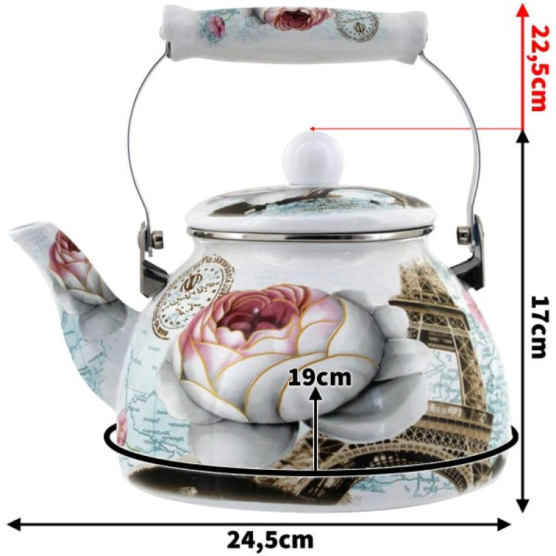 Chaleira Premium Aço Esmaltada Retrô Vintage 2,5L Paris Rosa - Conteúdo da embalagem: - 01 Chaleira sem apito - Ficha técnica • Altura com alça: 22,5cm • Altura Sem alça: 17cm • Diâmetro: 19cm • Material: Aço • Capacidade em litros: 2,5 litros • Este produto é revestida por esmalte e produzido por aço sendo assim mantendo o calor por mais tempo, também possui alças reforçadas e confortáveis mantendo sempre um padrão elegante e diminuindo risco de queimar a mão. é possivel servir xícaras de chá e café entre outras bebidas com seus sabores autênticos e deliciosos. • Linda para uso ou decoração, sem tirar o sabor do seu chá ou café com um toque de sofisticação. Com revestimento esmaltado ela é mais durável e higiênica. Fácil de limpar não transmite gosto ou odores em sua bebida mantendo o verdadeiro sabor. Cuidados: • Lave com detergente neutro e enxágue com água. • Para secar, utilize um pano seco e macio. • Evite o uso de produtos abrasivos. Características Gerais do Produto: • Material: Aço Inox Garantia: • Garantia do site - 1 Mês