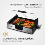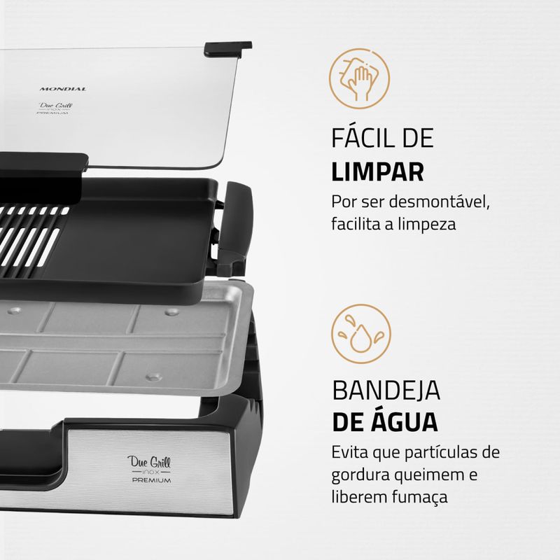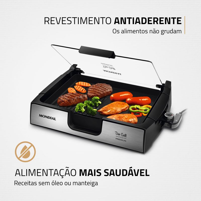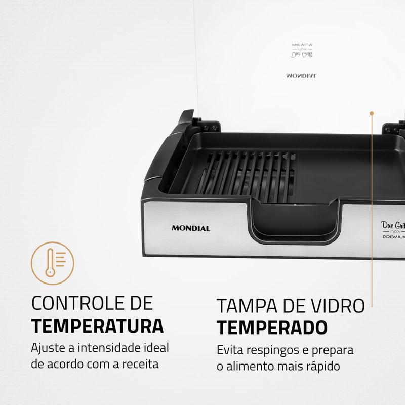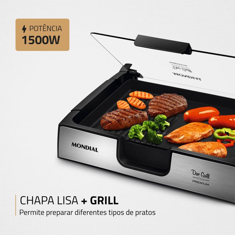 Prepare receitas mais saborosas e saudáveis com o Due Grill Inox Premium G-10 Mondial. Composto por chapa lisa e grill, permite o preparo de diversos tipos de pratos, e por ter revestimento antiaderente, não precisa adicionar óleo ou manteiga. Conta com peças removíveis que facilitam a limpeza, controle de temperatura e tampa de vidro temperado, que colabora com a preparação e é mais resistente. Saiba mais sobre o G-10 da Mondial: CHAPA LISA + GRILL: O Due Grill é composto por chapa lisa e grill e permite preparar diversos tipos de pratos. As chapas são perfeitas para vegetais, pães e carnes. Já o grill é indicado para hambúrgueres e espetinhos. POTÊNCIA DE 1.500W: Alta potência que assegura mais agilidade e eficiência no preparo de receitas variadas. REVESTIMENTO ANTIADERENTE: Alimentação mais saudável: os alimentos deslizam facilmente e não grudam. Não é preciso adicionar óleo ou manteiga. São pratos mais saudáveis e que mantêm o sabor e as propriedades dos ingredientes. PEÇAS REMOVÍVEIS: Por ser desmontável, facilita a hora da limpeza. TAMPA DE VIDRO TEMPERADO: A tampa colabora com uma preparação mais rápida, além de evitar respingos. O vidro temperado é resistente a quedas e mais durável. CONTROLE DE TEMPERATURA: Você pode ajustar a intensidade da temperatura de acordo com a receita que vai preparar. BANDEJA DE ÁGUA: Evita que partículas de gordura queimem e liberem fumaça. ACABAMENTO EM AÇO INOX : Garante beleza e mais durabilidade. UM ANO DE GARANTIA MONDIAL: A Mondial é a escolha de milhões de consumidores. Mondial, a escolha inteligente!