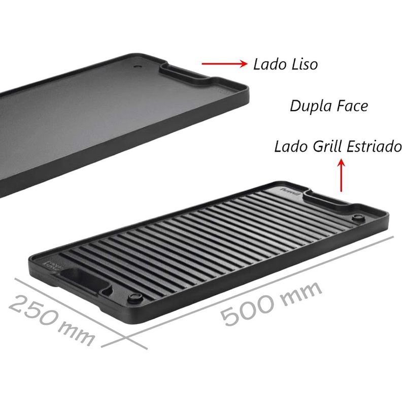 Chapa Dupla Face Retangular de Ferro Panela Mineira 50x25cm A Chapa Dupla Face Retangular Alça de Ferro da Panela Mineira possui um design autêntico, com um dos lados liso e o outro estriado. Ideal para preparar carnes, legumes, peixes e outros pratos, de maneira prática e eficiente, em qualquer uma de suas faces. Sua excelente distribuição e retenção de calor, característico do ferro fundido, mantém os alimentos aquecidos por muito mais tempo, além de enaltecer seus sabores e aromas. Pode ser utilizada diretamente sobre todas as fontes de calor, assim como churrasqueiras. Onde Usar: Pode ser utilizado em fogões a gás, a lenha, churrasqueira e fogo de chão. Orientação de Uso e Conservação:Antes do primeiro uso: Lave com água e sabão, seque bem com um pano e leve ao fogo para remover toda a umidade. Já vem pronta para uso, então não precisa ser curada. Guarde em um local seco. Após cada uso: Lave com água e sabão, usando uma esponja ou escova para remover todos os resíduos de alimentos. Se restarem resíduos, ferva água com um pouco de detergente para soltá-los. Pintura: Revestimento atóxico que garante durabilidade e proteção prolongada, sem causar nenhum dano à saúde. Características Técnicas e Medidas:Material: Ferro Fundido.Comprimento: 50cm.Modelo: Retangular.Linha: Artesanal.Largura: 25cm.Altura: 2,5cm.Alças: Ferro.Peso: 5,3Kg. Itens Inclusos:01 Chapa Dupla Face Retangular de Ferro Panela Mineira 50x25cm. Código: 750PMProdutoLojaPlast.