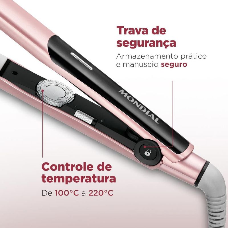 A incrível Chapinha | Prancha Golden Rose da Mondial era o que faltava para finalizar seu cabelo com o que há de mais moderno e tecnológico no mercado!Essa lindíssima prancha conta com o revolucionário Wet & Dry que permite que você possa alisar os cabelos secos ou úmidos, sem danificar a estrutura do fio, garantindo assim, o máximo de praticidade para você, pois não é necessário escovar os cabelos antes do uso.Essa chapinha também conta com Tecnologia Tourmaline que através da liberação de íons negativos e do mineral Turmalina, fecham as cutículas dos fios, preservando a umidade natural e evitando o ressecamento. Além disso, esse recurso também diminui o frizz e a eletricidade estática, eliminando assim o aspecto de cabelo arrepiado. O resultado é um cabelo muito mais macio, hidratado, bonito e com um brilho radiante. As chapas possuem Base Cerâmica que protegem as madeixas do calor excessivo e contam com Sistema de Flutuação que se adaptam ao fio, proporcionando um deslizar muito mais suavemente e um alisamento uniforme, sem marcasA Prancha Golden Rose ainda possui controle de temperatura de 100°C a 220°C. Assim, você poderá escolher o que é melhor para você, de acordo com o resultado desejado, adequando-se até mesmo para quem possui fios mais finos, frágeis e os quimicamente tratados.Garanta agora mesmo mais beleza e praticidade para suas madeixas com essa linda Chapinha Golden Rose com qualidade que somente a Mondial pode te oferecer!