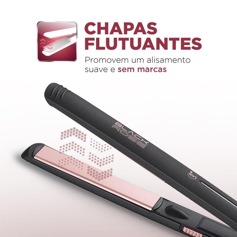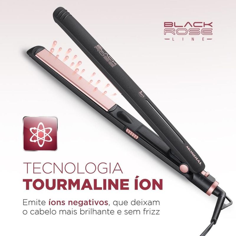 A prancha é um acessório ideal para finalizar e dar aquele acabamento perfeito, de acordo com o seu estilo e mudar o visual sempre que quiser. A Prancha Mondial Black Rose P-27 tem chapas de cerâmica com tourmaline, garantem cabelos com liso intenso, com mais brilho e sem frizz. A tecnologia Protect Care permite um condicionamento iônico e aquecimento controlado que protegem os fios, além disso, as chapas são flutuantes, com fácil adaptação às mechas para um deslizar suave e alisamento uniforme. Moderna, bonita e fácil de usar, seu cabo giratório 360° auxilia nos movimentos durante o uso, com lâmpada led que indica o funcionamento e trava, itens que garantem segurança. O acabamento em soft touch proporciona toque delicado ao produto e suavidade na pegada, para você usar o tempo necessário sem cansar as mãos.